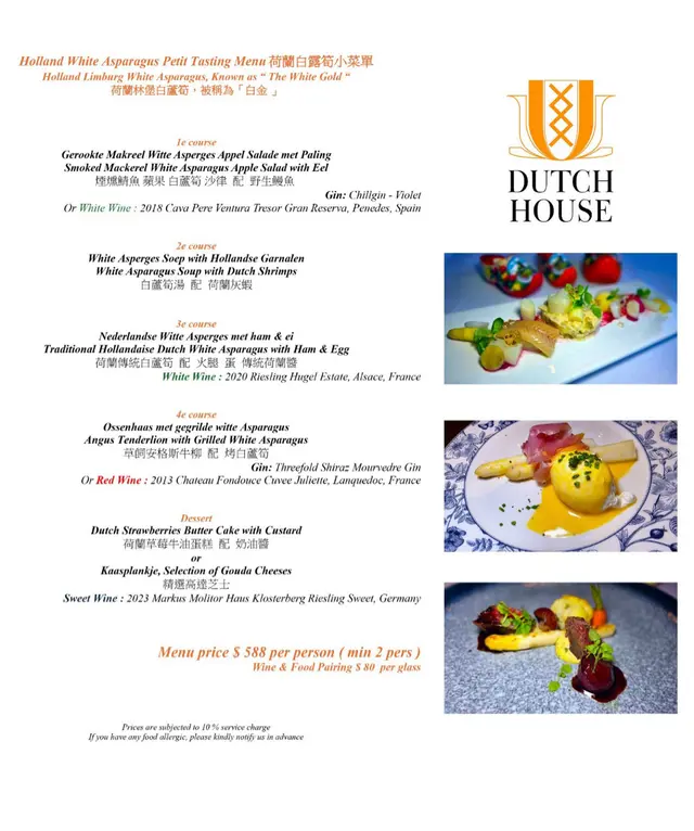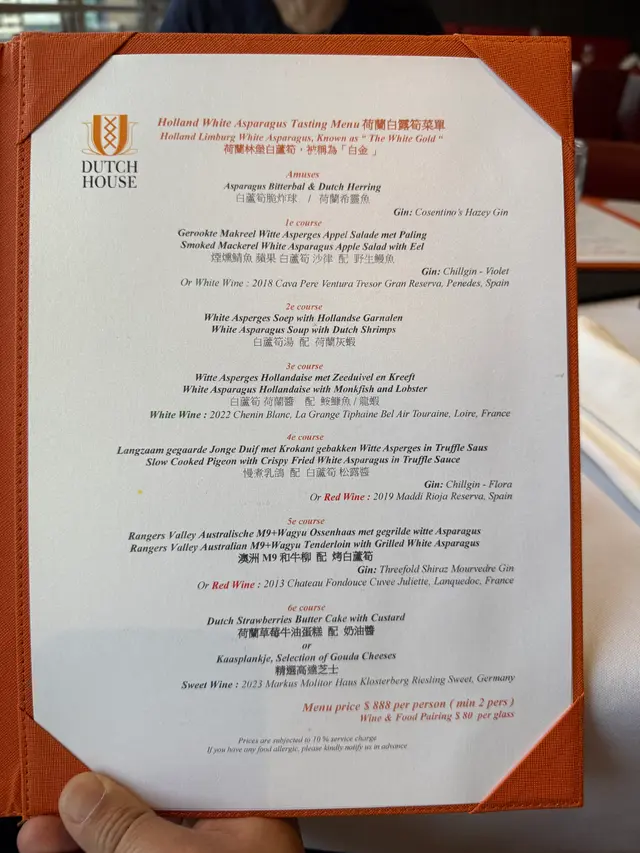 In HK we can find delicacies from all over the world, but somehow Dutch cuisine is virtually unheard of. So, when I saw the promotion of The Dutch House on social media, I immediately made a reservation to explore.The restaurant is on 13/F of VIP Commercial Centre in TST, and we are seated at a table on the window side, having a nice view overlooking Kowloon Park. Neat décor, with some post-impression style paintings on the walls, to pay tribute to the famous Dutch artist Van Gogh.I have pre-ordered the seasonal Holland White Asparagus Tasting Menu ($888 each) with also wine pairing. A smart approach is that they charge per pairing ($80 each), so allowing the diner to choose which and how many glasses they like.There are two starters. On the left is the Dutch Herring tartlet, with the chopped herring nicely marinated and flavourful. On the right is Asparagus Bitterbal, replacing the oxtail meat in the traditional snack with asparagus and Italian ham. Both are delicious.The first pairing is in fact not wine, but a gin called Hazey Gin. Developed together with celebrity chef Chris Cosentino, the spirit has many fragrant herbs, pleasant on the nose and palate, but its strong alcohol level may not work for everyone.The first course is Smoked Mackerel White Asparagus Apple Salad with Eel. The mackerel and green apple and finely chopped and mixed like tartar, with white wine vinegar pearls and asparagus on top. The gorgeous smoked eel is from a wild river species only available in Holland. Together with beetroot and asparagus pickled in beetroot juice to give a beautiful red colour, this salad is phenomenal in taste. My favourite dish in the evening.The wine paired is Pere Ventura Tresor Gran Reserva 2018, a Cava from Penedes in Spain. The sparkling wine from the traditional blend of Macabeo, Xarel-lo, and Parellada, with nice persistent bubbles, crisp green apple and citrus zest, and toasty.The second course is White Asparagus Soup with Dutch Shrimps. The shrimps are small but intense in taste, with also good bite. Added with some chopped poached eggs, the soup is of perfect thickness, delicate with the refined flavours of the white asparagus and not overly seasoned. Another wonderful dish.The third course is White Asparagus Hollandaise with Monkfish and Lobster. Adopting the traditional style to enjoy white asparagus with poached egg and Hollandaise sauce, the chef has also added monkfish and lobster on the side, which are very good on its own, to complement the true anchor of the dish, the prized ‘white gold’.The wine paired is Domaine La Grange Tiphaine Bel Air 2022, a Chenin Blanc from Touraine in Loire Valley of France. A fruity wine with good minerality and richness, it is a versatile wine that can match both the hollandaise sauce and rich flavour seafood.The fourth course is Slow Cooked Pigeon with Crispy Fried White Asparagus in Truffle Sauce. Beautifully presented, the pigeon is very tender and juicy, with the deep-fried asparagus on the side, together with some okra and onion, and finished with the truffle sauce to enhance the earthy tone and savoury. Another of my favourite dishes.The wine paired is Maddi Rioja Reserva 2019. The intense aromas of this Spanish red show a lot of spices and balsamic characters, with also cocoa, earth, and oak. Good to match with the pigeon and truffle sauce.The fifth course is Rangers Valley Australian M9+ Wagyu Tenderloin with Grilled Asparagus. The beef is soft and tender, with a nice gravy sauce on top. The grilled asparagus is very nice, along with some bell pepper and cauliflower. Another nice dish. I think if the beef is from a cut with a slightly chewier texture, it might be even better.The wine paired is Chateau Fondouce Cuvee Juliette 2013, with the owner of this Languedoc estate being a good friend of the chef. It has nice, forward Grenache characters, but is in fact a blend, with delicate light oak and sweet spice on top of the ripe black fruit.The sixth and final course is Dutch Strawberries Butter Cake with Custard. The strawberry gelato is delicious, not too sweet, with some fresh strawberries and puree added, plus a bit of crumbs on top to give extra texture. On the side is a homemade butter cake, which is also nice. A pleasant finish to a satisfying meal.The wine paired is Markus Molitor Wehlener Klosterberg Riesling Kabinett 2020. The Mosel wine does not have the necessary sweetness and honestly does not match with the dessert. I guess there may be a mistake on the choice here.Service is good, and the bill on the night is $2,651. The food, ambience, and overall experience is nice, and while I am not sure how authentic its Dutch cuisine, it is certainly delicious. But seeing how slow business is, I feel sad and hope they will get more customers, as it is with diversity and quality that made HK an international food heaven, and we need restaurant like this one to uphold our pride heritage.…查看更多