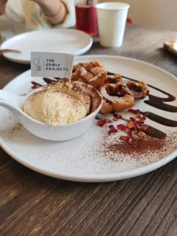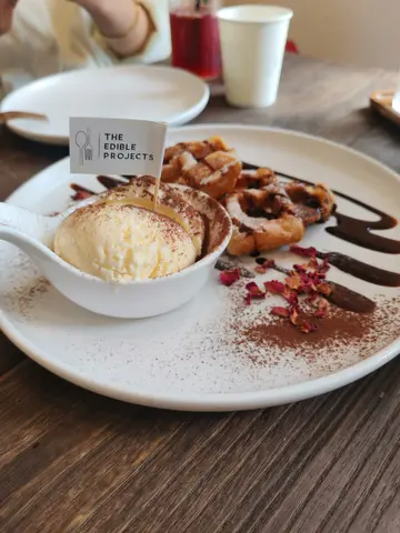 The Edible Projects系一间社企餐厅,主打可持续饮食同社区共融。黄白相间嘅建筑外墙好抢眼,室内设计简约温馨,阳光充足,坐得舒服。 整体感觉不错,环境及食物卖相加分,适合慢慢叹一餐。叫咗All Day Breakfast,配料好丰富:有机沙律、香草肠仔、番茄、炒蛋、吐司同炸鸡。有炸鸡配泰式辣酱几有惊喜,外脆内嫩,味道唔错,整体卖相吸引,岩打卡,份量亦十分足够。 甜品方面试咗牛角窝夫配雪糕,朱古力加雪糕一齐食好夹,唔太甜,窝夫外脆内软,口感几好。 咖啡叫咗Cappuccino,奶泡绵密,味道中规中矩,配早餐啱啱好。…Read More