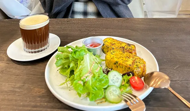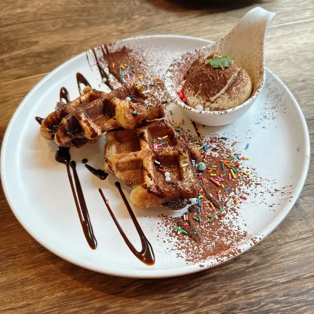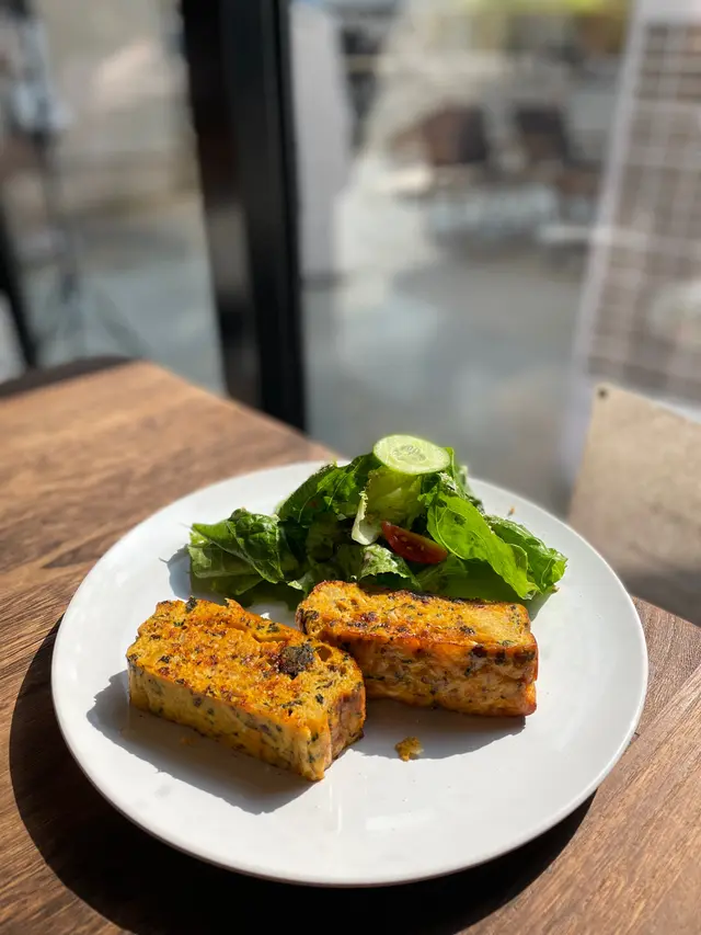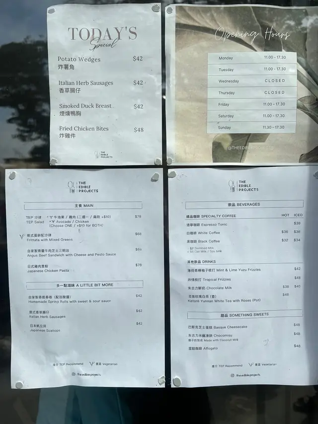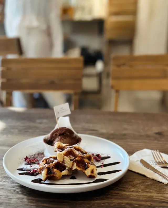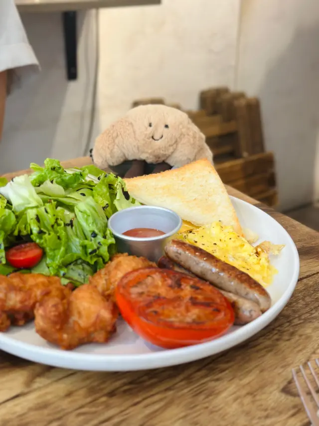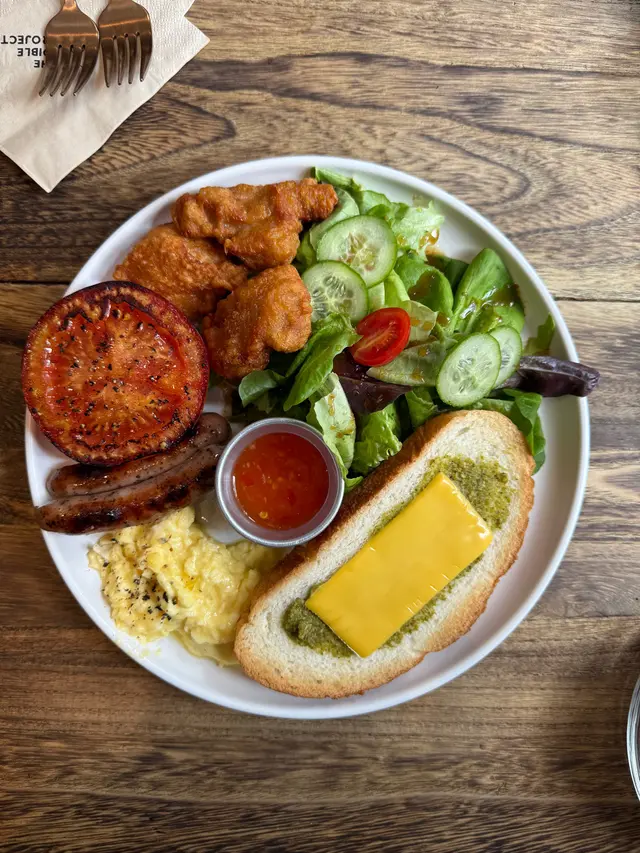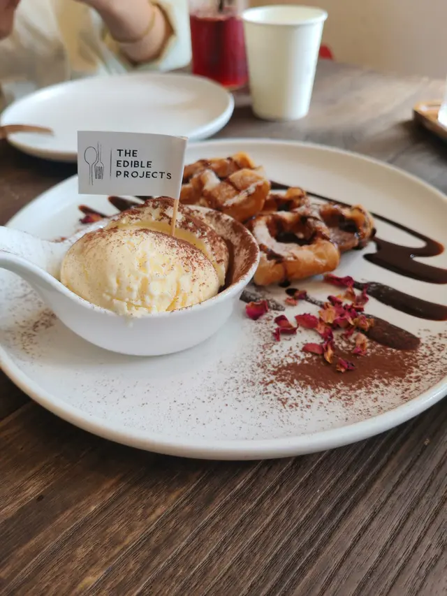 The Edible Projects係一間社企餐廳,主打可持續飲食同社區共融。黃白相間嘅建築外牆好搶眼,室內設計簡約溫馨,陽光充足,坐得舒服。 整體感覺不錯,環境及食物賣相加分,適合慢慢歎一餐。叫咗All Day Breakfast,配料好豐富:有機沙律、香草腸仔、番茄、炒蛋、吐司同炸雞。有炸雞配泰式辣醬幾有驚喜,外脆內嫩,味道唔錯,整體賣相吸引,岩打卡,份量亦十分足夠。 甜品方面試咗牛角窩夫配雪糕,朱古力加雪糕一齊食好夾,唔太甜,窩夫外脆內軟,口感幾好。 咖啡叫咗Cappuccino,奶泡綿密,味道中規中矩,配早餐啱啱好。…查看更多
