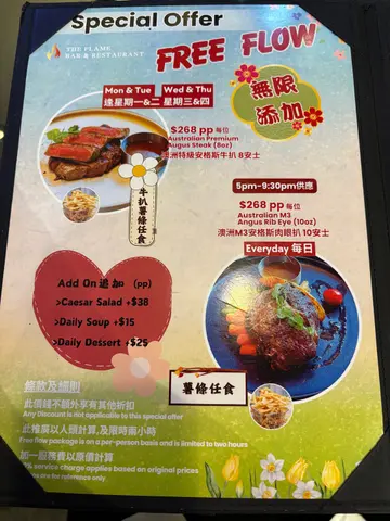 虽然自己并唔大食,但每次听到任食牛扒薯片都会心郁郁。今晚终于可以挑战。逢星期一至四都有任食牛扒同薯条供应。餐厅有齐室内同户外位置,仲要宠物友善,活动包场仲有9折。澳洲特级安格斯牛扒8安士平时出去食一块扒,可能都要呢个价,而家任你食到够。而且牛扒唔会因为任食而比颓嘢你,如果拣五成熟,中间呈粉红色,口感香嫩,有酱汁,出品并唔hea,第二round都冇变质。讲真,食到两round其实都赚番。薯条如果你本身钟意食薯条,呢度系实现你嘅薯条自由,每次都系热辣辣一桶比你,再配埋茄汁,记得问职员拎黑椒加埋仲好食。除咗又唔食牛扒薯条,可以加配沙律,汤同甜品。Caesar salad沙律都几大碟,有烟肉干,脆面包,咬口丰富。Daily Soup追加餐汤只有一款,杂菜汤都比足料。Mount Fuji如果食牛扒想叫杯嘢饮,呢杯打咭够晒吸引。富士山造型再加花既点缀,令人爱不释手。Daily dessert朱古力慕丝蛋糕卖相吸引,浓香朱古力味。…查看更多