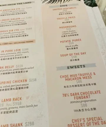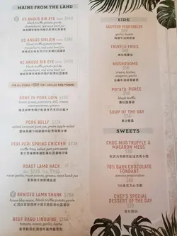 三文鱼他他配香草乳酪汁 / 低温慢煮香草乳酪三文鱼 / 招牌炕烧猪小排配沙律薯条 / 美国安格斯肉眼扒配薯条沙律 / 特级黑安格斯斧头扒 / 脆皮蜜糖柑桔烧腩肉