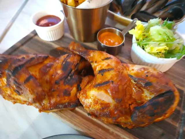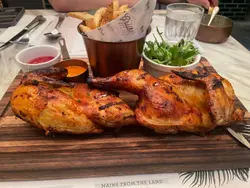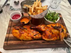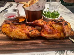 葡式香辣烧春鸡配黑松露薯条少律 $238上枱果阵心谂:乜呢只真系春鸡嚟架咩?! SIZE明明系芝麻鸡咁大🙈烧鸡烧到啱啱熟,鸡髀骨仲有少少红;调味适中,胸位较厚难入味,可以沾附上嘅烧鸡酱,呢个酱浓红椒粉味、辣味几出、而且酸酸地可以减腻。黑松露薯条份量好多,而且系淡淡松露味,唔会好煤气,易入口。