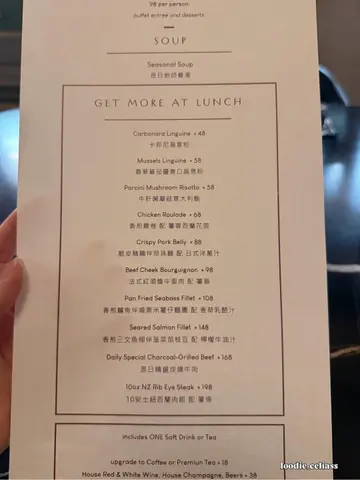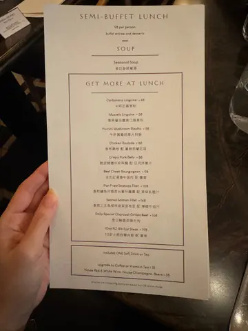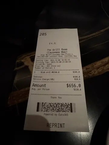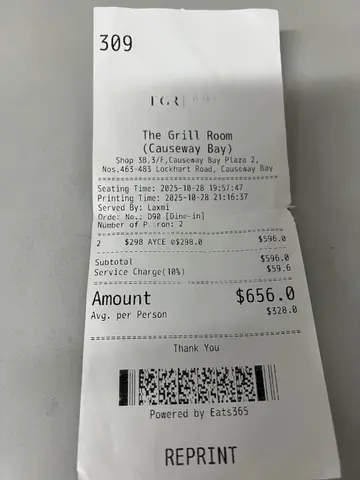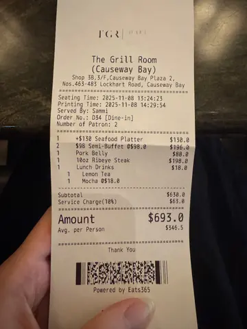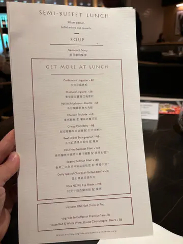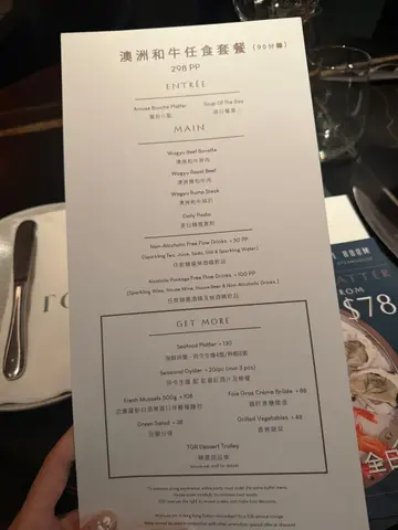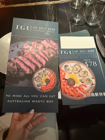 第一次去位于铜锣湾广场二期的The Grill Room. 我系晚饭时间去,餐厅有外籍人士弹结他唱英文歌,气氛好好。餐厅地方几大,楼底高,座位舒适。⭐️澳洲和牛任食套餐(90分钟),有三种不同的选择。今次我系食澳洲和牛套餐($298一位)。呢个套餐包括有是日餐汤,薯条&田园沙律,澳洲和牛脊肉,澳洲烧和牛肉,澳洲和牛冧扒,香草蕃茄牛面肉大通粉,青口辣肉肠大通粉。食物食完可以再添。和牛每次order, 系每款两件。几款和牛都好味。我个人最钟意⭐️和牛脊肉,牛肉味浓郁,烧嘅熟度刚刚好。⭐️烧和牛肉,薄切好大块,肉质好滑好juicy. ⭐️是日餐汤系南瓜汤,好creamy好滑,香浓南瓜味道。⭐️薯条新鲜炸起,好香口香脆。⭐️香草蕃茄牛面肉大通粉。通粉好烟靭,软硬度刚刚好。蕃茄汁味道浓郁,好好味。牛面肉好入味,爽口嫩滑。⭐️青口辣肉肠大通粉。蕃茄汁少少微辣唔会好辣。,好惹味,好开胃。呢间餐厅的食物质素好高。餐厅员工服务都好好,好有礼貌。呢个价钱有澳洲和牛任食同高质素嘅用餐环境,好超值,值得推介。…查看更多