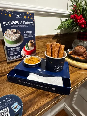 今次特地过嚟,净系为咗佢嘅雪糕曲奇!点知撞到全新圣诞限定系列,舖头环境都布置得好,有圣诞气氛,心情劲好款款卖相都靓到打卡无难度,味道更是冇得弹!重点推荐西班牙油条配雪糕,即叫即炸,咬落卜卜脆,外脆内软正到癫!再蘸埋浓郁朱古力酱,配埋自选口味的雪糕,好味到停唔到口,一冷一热好过瘾冧酒栗子雪糕呢款又系超正👍唔会太甜 食到栗子的口感🌰雪糕球比平时的雪糕店大很多而且好钟意佢哋嘅雪糕杯design可以金属的质感更可保持雪糕的温度更长慢慢食得冇咁快溶化配上咖啡 和这款充满圣诞气氛的苹果批曲奇呢个配搭真系好完美