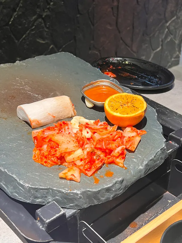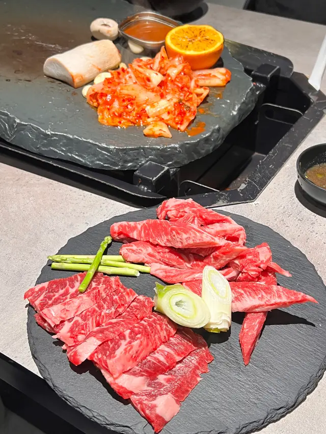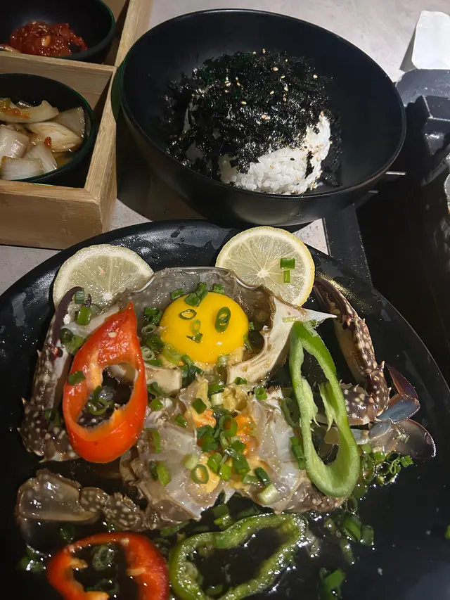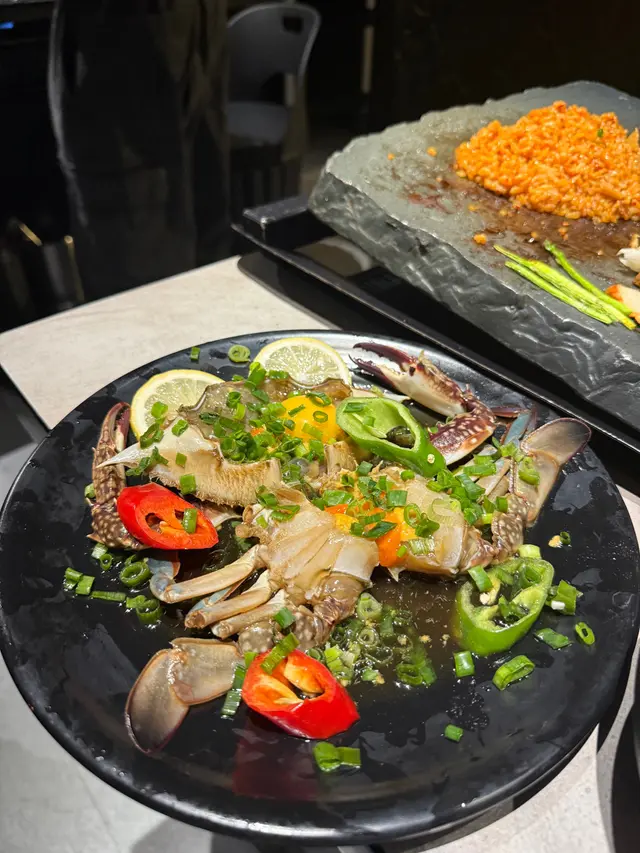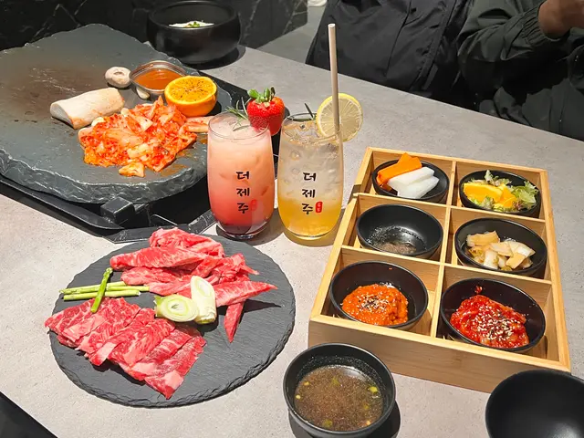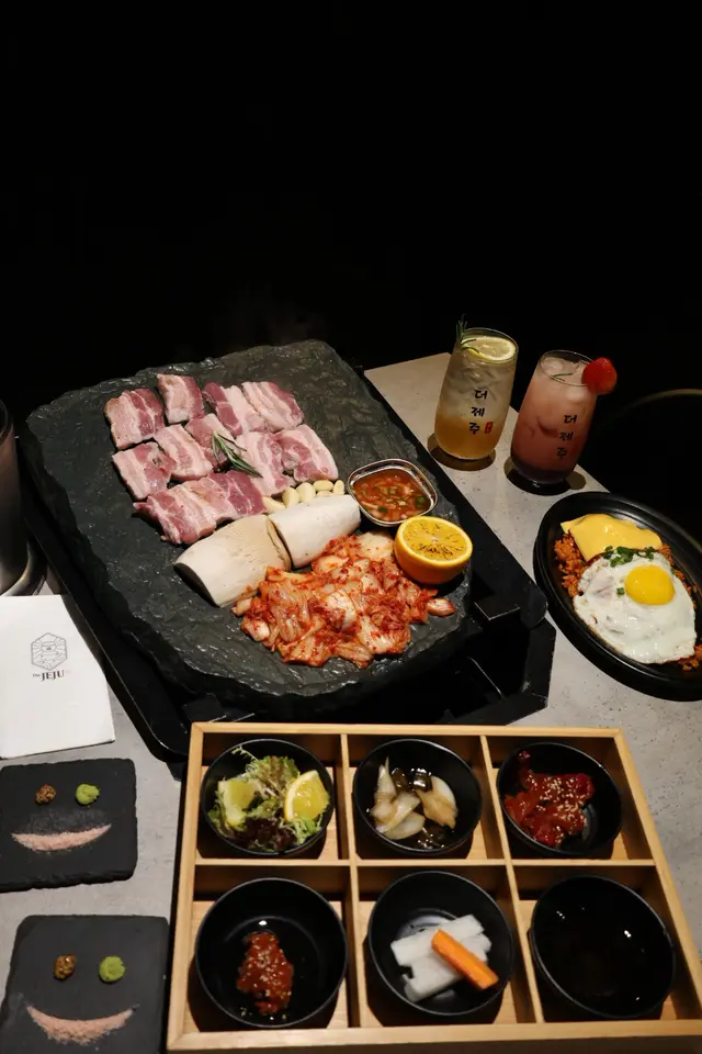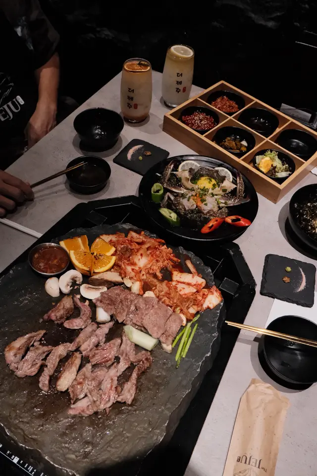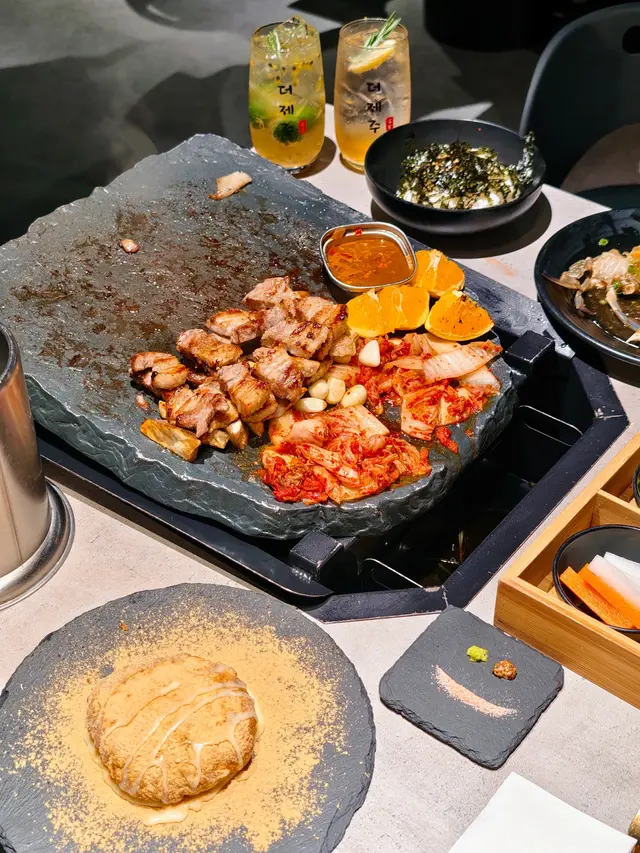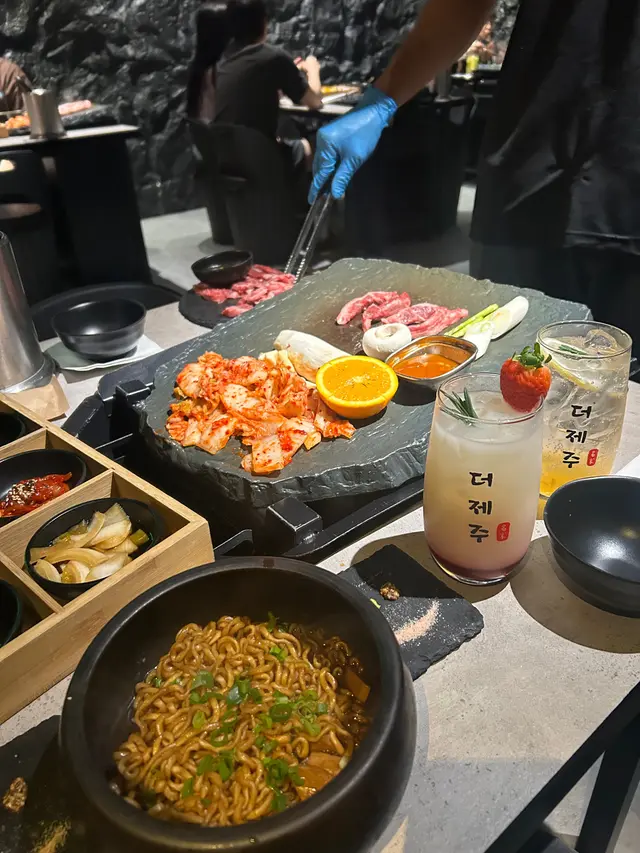 近期旺角有一間人氣大熱既濟州燒肉,超火熱又得意, 所以我都湊熱鬧立即約朋友去食~餐廳以仿傚濟州玄武岩洞穴為裝修主題,牆身是深色石材牆, 好似火山岩石般,帶點神秘及型格感覺,餐廳全部由韓國人主理,店員都是韓國人,好有feel~當晚好多人慶祝生日,店員都超high 幫手慶祝, 好好氣氛🥳餐廳用上由韓國定製的火山石烤盤嚟烤肉,受熱更加均勻,更能鎖住肉汁,餐廳烤肉工作全部由店員處理,可以安坐座位中開心吃肉肉, 超開心~🥳🌟牛肉套餐B (牛肋骨肉+牛板腱肉+炒飯)($696)每枱都會送上前菜6款,當中仲有魷魚漬,超好味。朋友想食牛肉,所以就揀咗牛肉套餐B,包括牛肋骨肉200g及牛板腱肉100g。牛肋骨肉肉味濃郁,較有口感,而牛板腱肉則較軟淋,2款都好唔錯。套餐仲可以選炒飯或炸醬拉麵,我地就揀咗炒飯,經過火山石烤盤炒過,再加上芝士及煎蛋,炒飯口感更豐富,亦更惹味。 燒烤的配菜都好豐富,包括泡菜,雞髀菇及濟州柑橘,特別一讚濟州柑橘,烤過的濟州柑橘清甜無渣,食烤肉時解膩一流💫🌟醬油蟹($318)見到有醬油蟹,忍唔住叫咗一隻。醬油蟹好多蟹膏,再加上淡淡的醬油香,不會死鹹,鮮味好食,配上紫菜飯同吃,真係超正!🌟甜品:Jeju Yeah Yeah ($70)最後當然要食埋甜品先完滿啦,濟州島石爺做型的芝麻奶凍,可愛又香濃,內裏仲包住蜜柑,帶水果香甜,配上Oreo碎及雲呢拿雪糕,味道唔錯👍🏻🌟飲品:士多啤梨米酒|哈拉邦米酒 ($68@)好鍾意韓國的米酒, 米味香甜, 酒味又不會太濃, 所以點了2杯水果口味的米酒,哈拉邦即是濟州的橘子, 加入米酒裏, 清爽清甜, 而士多啤梨米酒則多了一份香甜, 2款都很不錯😋…查看更多