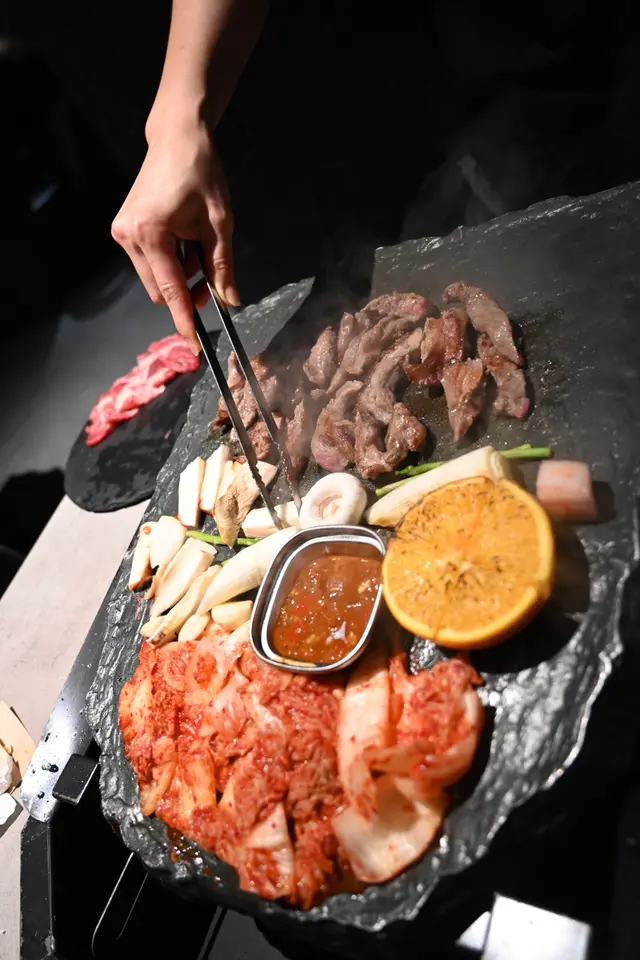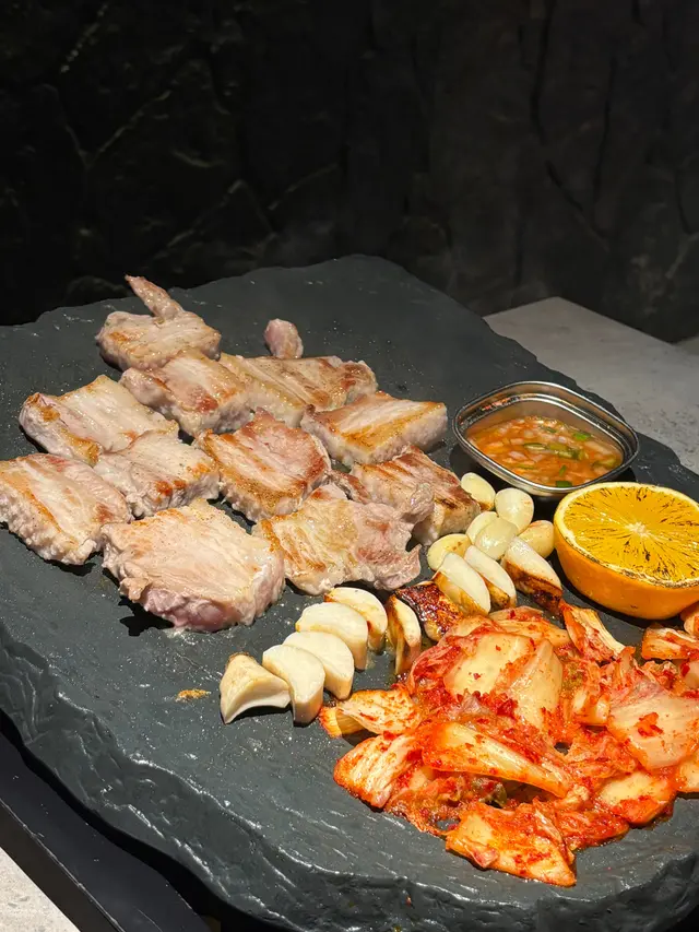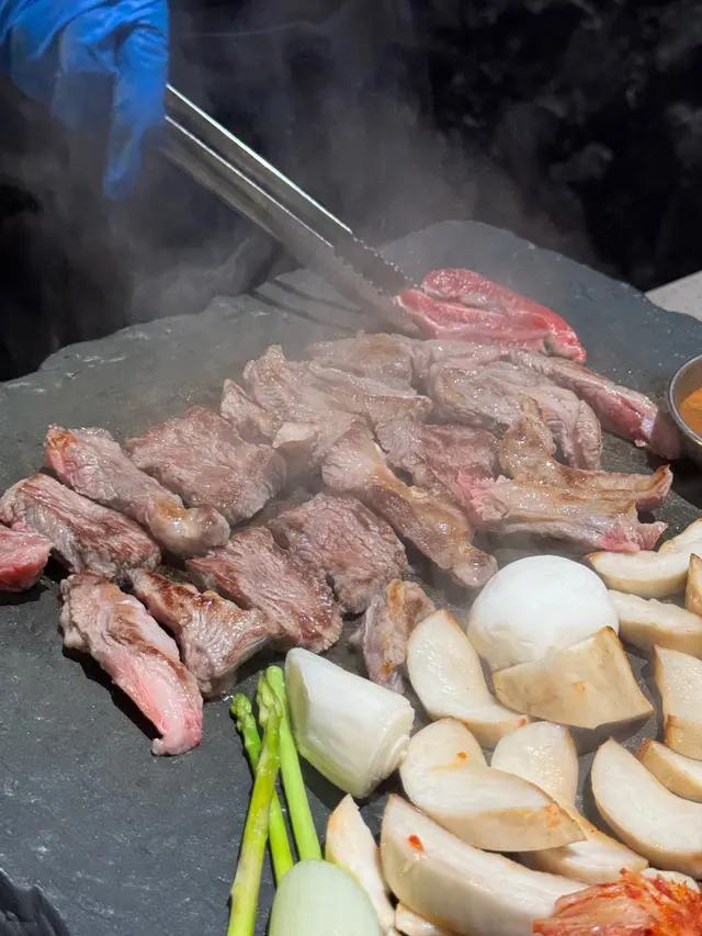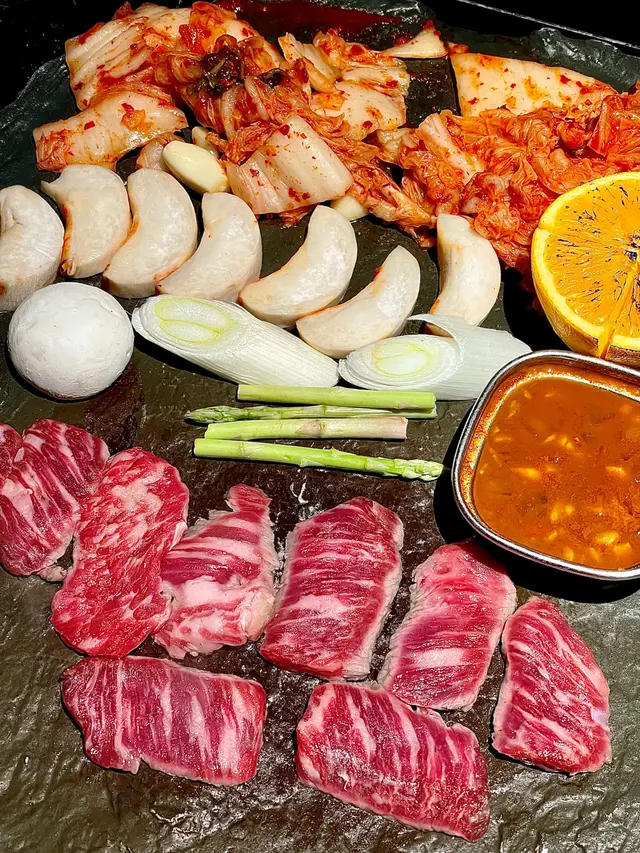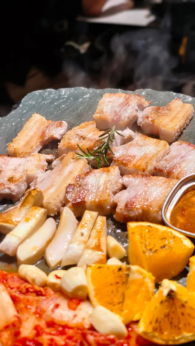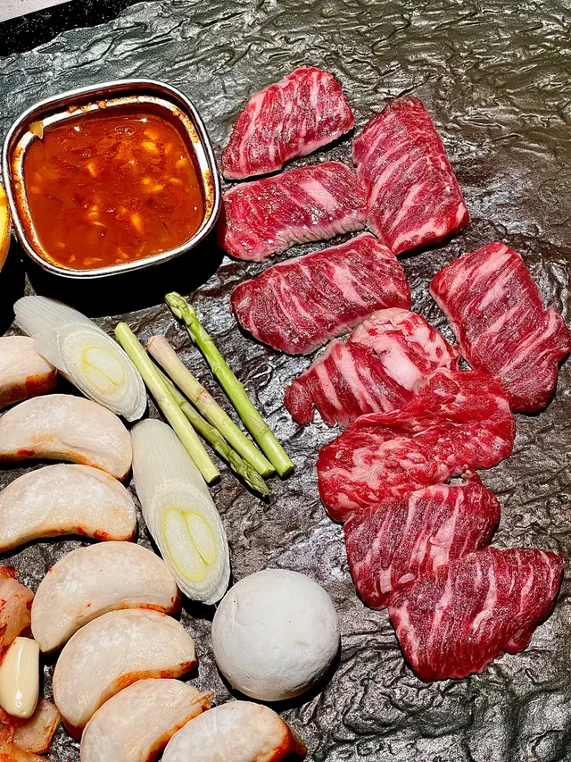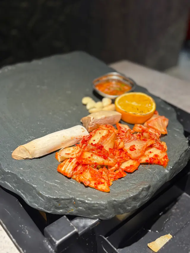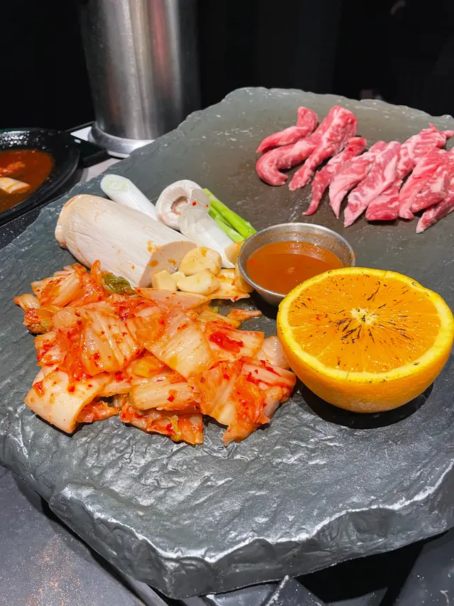 近期旺角有一間人氣大熱既濟州燒肉,超火熱又得意, 所以我都湊熱鬧立即約朋友去食~餐廳以仿傚濟州玄武岩洞穴為裝修主題,牆身是深色石材牆, 好似火山岩石般,帶點神秘及型格感覺,餐廳全部由韓國人主理,店員都是韓國人,好有feel~當晚好多人慶祝生日,店員都超high 幫手慶祝, 好好氣氛🥳餐廳用上由韓國定製的火山石烤盤嚟烤肉,受熱更加均勻,更能鎖住肉汁,餐廳烤肉工作全部由店員處理,可以安坐座位中開心吃肉肉, 超開心~🥳🌟牛肉套餐B (牛肋骨肉+牛板腱肉+炒飯)($696)每枱都會送上前菜6款,當中仲有魷魚漬,超好味。朋友想食牛肉,所以就揀咗牛肉套餐B,包括牛肋骨肉200g及牛板腱肉100g。牛肋骨肉肉味濃郁,較有口感,而牛板腱肉則較軟淋,2款都好唔錯。套餐仲可以選炒飯或炸醬拉麵,我地就揀咗炒飯,經過火山石烤盤炒過,再加上芝士及煎蛋,炒飯口感更豐富,亦更惹味。 燒烤的配菜都好豐富,包括泡菜,雞髀菇及濟州柑橘,特別一讚濟州柑橘,烤過的濟州柑橘清甜無渣,食烤肉時解膩一流💫🌟醬油蟹($318)見到有醬油蟹,忍唔住叫咗一隻。醬油蟹好多蟹膏,再加上淡淡的醬油香,不會死鹹,鮮味好食,配上紫菜飯同吃,真係超正!🌟甜品:Jeju Yeah Yeah ($70)最後當然要食埋甜品先完滿啦,濟州島石爺做型的芝麻奶凍,可愛又香濃,內裏仲包住蜜柑,帶水果香甜,配上Oreo碎及雲呢拿雪糕,味道唔錯👍🏻🌟飲品:士多啤梨米酒|哈拉邦米酒 ($68@)好鍾意韓國的米酒, 米味香甜, 酒味又不會太濃, 所以點了2杯水果口味的米酒,哈拉邦即是濟州的橘子, 加入米酒裏, 清爽清甜, 而士多啤梨米酒則多了一份香甜, 2款都很不錯😋…查看更多