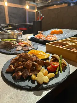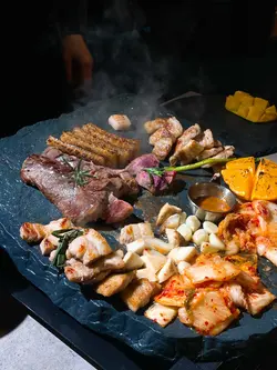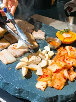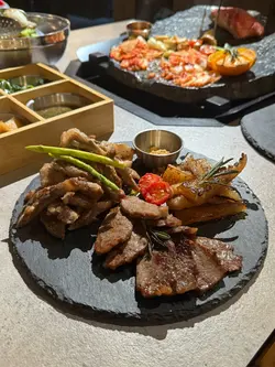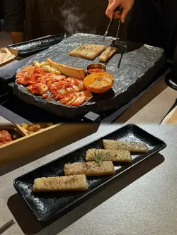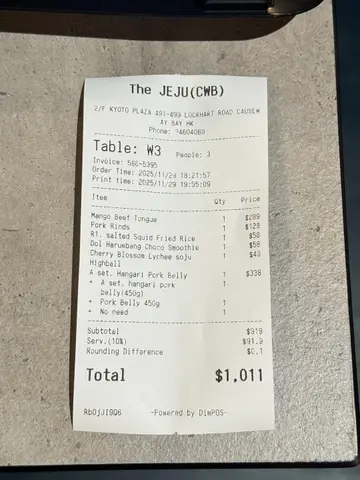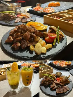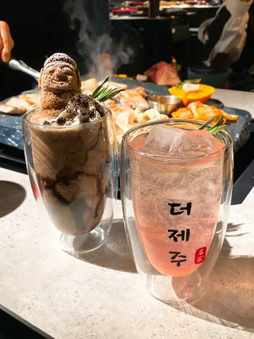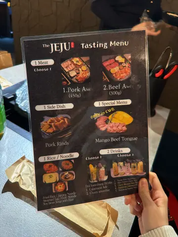 喺铜锣湾做完嘢,约咗屋企人一齐食晚饭🍽️。几个月前喺朗豪坊食过呢间The Jeju,见到佢哋继中环之后,喺铜锣湾又开咗新分店,屋企人指明要食呢间😆!餐厅主打食正宗高级韩烧,由韩国人经营,装修到好似喺洞穴入面咁样,好有气氛🔥!〰️〰️〰️〰️〰️〰️〰️〰️〰️服务员会预先用猪油开炉,再放啲泡菜、橙、蒜头、竹笋同烧汁喺铁板上,之后可以配烧烤肉一齐食,好贴心呀~🐮 Beef B Set (300g) $696 牛肋骨肉200g+牛板腱肉 100g+炒饭或炸酱拉面 牛肉超级好食,全程有店员帮手烧,唔使自己动手超舒服😌。呢个套餐适合二至三人享用,可以一次过试两款唔同部位嘅牛肉。我哋拣咗炸酱拉面,仲加咗$20煎蛋芝士,建议一定要加🧀!口感同味道即刻提升,拉面挂满酱汁,配埋半熟蛋同芝士,真系超级正呀~🥭 芒果牛舌(350g) $458 餐牌建议呢个系2人份量,牛舌超厚超大条,同样有店员帮手烧,烧到啱啱好👌。第一次食牛舌配芒果,食落芒果清甜,牛味好香,味道意外地夹!牛舌嘅弹牙同芒果嘅爽甜,真系令人印象深刻~🐷 猪皮 $128 店员会先帮我哋烧猪皮,烧到金黄香脆,然后点花生粉一齐食🥜。猪皮爽脆弹牙,点咗花生粉之后,味道更加丰富,同样系第一次试呢种配搭,好有惊喜!🍧 济州爷爷朱古力沙冰 $58 🍊 济州爷爷金桔百香果梳打 $58 呢两杯饮品真系必点!有济州爷爷冰沙公仔,超级打卡able📸,味道仲要超级好饮~食完浓味嘅烧烤,饮返杯清甜嘅饮品,真系好解渴呀!最后仲有六款韩式小菜,配牛肉一齐食又得,就咁食都可以,味道超级正宗👍🏻~ 〰️〰️〰️〰️〰️〰️〰️〰️〰️💰 总计: $1560 (已包含10%服务费)…查看更多