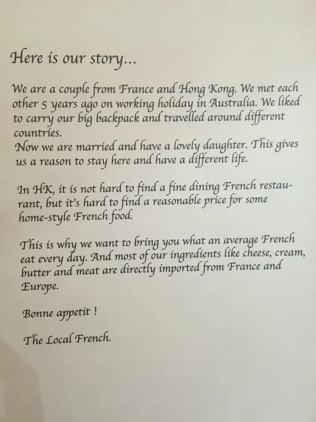 只係係柯士甸經過,見到呢間法國小店,價錢便宜就入左去了!當晚只有我們一枱享用晚餐,好靜好舒服!2個人叫左兩碗法式蟹湯、半份法包、煙三文魚山羊芝士意大利面、油封鴨脾配薯塊。蟹湯好濃味好香,就算過左好耐果浸香味仲係口內;法包外脆內軟,好鬆片,烤得剛剛好;意大利面個羊芝士好重,如果唔食得太濃嘅朋友可以叫拒地少d;鴨髀肉好嫩滑,個薯塊直情比滿分,一片片好薄好似薯片,仲要加埋香草真係好香!…查看更多