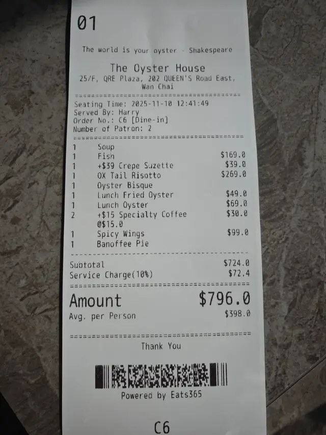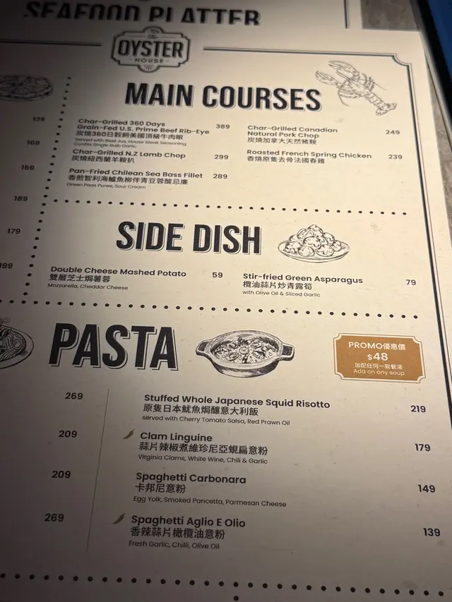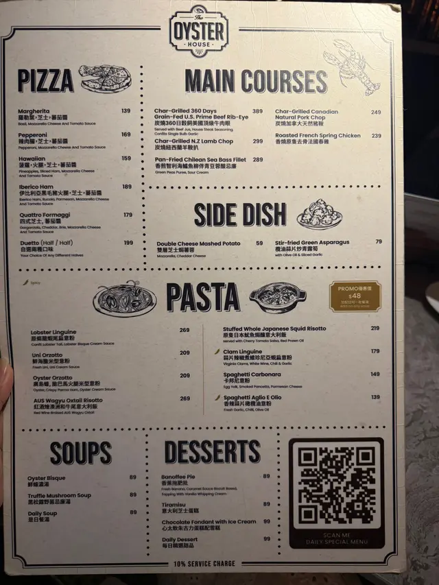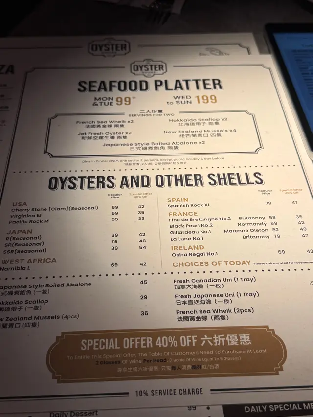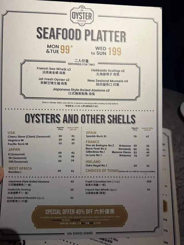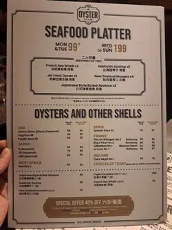 The Oyster House 📍湾仔皇后大道东202号QRE Plaza 25楼 去左湾仔一栋食肆林立既QRE Plaza食意大利西餐🍴🍽️ ,主打食生蚝🦪,多款不同国家既生蚝选择,品尝意大利菜也不能错过! 当然点了Seafood Platter 原来餐厅每逢星期一及二都可以优惠价$99就可以试到一set,好高性价比真系每枱都会点! 💫海鲜拼盘 - 有5款海鲜包括有,法国黄金螺x2、北海道带子x2、新鲜直送生蚝x2、纽西兰青口x4 同埋日本矶煮鲍鱼x2,海鲜系有质素新鲜鲜甜重海水味。✴️ 💫鲜蚝浓汤 - 呢个汤🥣必点亦唔系度度有,浓郁嘅生蚝鲜味融入汤中,质感顺滑味道极丰富,汤中大大只蚝肉🦪令浓汤富有层次感。 💫烤牛骨髓伴和牛肉眼粒配法包多士 - 大大条牛骨满载好多和牛肉眼粒同洋葱,一下一下🍴将邪恶既牛骨髓刮出嚟,放系脆脆既法包多士上面,一入口满满油脂香,真心好食回味无穷。💫 💫Margherita pizza 🍕 - 罗勒叶、芝士、蕃茄酱既pizza 好好食,薄饼底脆口充满酸酸甜甜。 💫蟹肉牛油果酱🥑塔配黑鱼子 - 牛油果酱绵密香浓,鲜甜蟹肉🦀浸出海水味,黑鱼子咸香点缀,口感丰富又有惊喜💥,艺术品的享受。 最后甜品Tiramisu🍯完美收尾,好滑咖啡酒味香浓,幸福❤️既味道。 整体来说,The Oyster House🍽好适合放松聊天及庆祝的好地方,不但食物水准高,环境浪漫。记住星期一、二来食海鲜拼盘,真系好抵食又好味。💯…查看更多