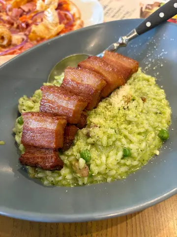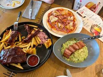 我们点了一个9寸的招牌薄饼signature piggie, 食材十足又高质,品尝起来就像在欧洲吃的一样美味。点了一份慢煮酱烧猪肋骨:份量大、居然有二大块,肉质细嫩,烤得很好吃。连拌菜薯条、烤菠萝也是出色。烤猪腩肉西洋菜烩意大利饭:这个也很有特色,好吃,就是好像放得太多油了。总体而言,这家餐厅的出品很"欧式",烹调认真、味道出色,而且餐厅的装饰设计也很精致漂亮,适合打卡拍照。唯一的缺点就是有点小贵,人均二百多元。