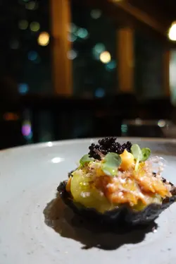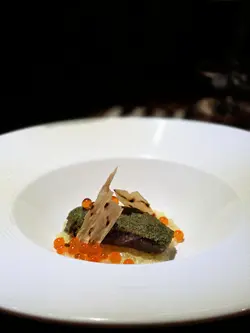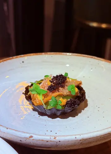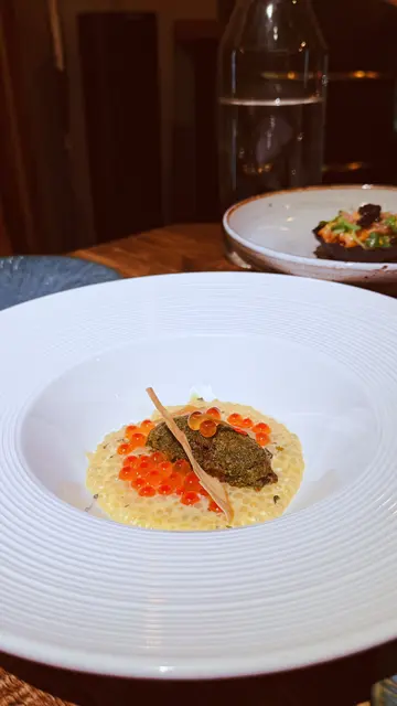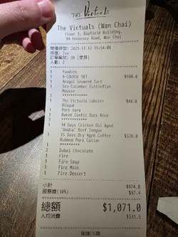 位于湾仔的新派法国菜餐厅。 和好友的每月一聚,这次选了位于修顿球场对面、主打自家熟成肉的新派法国料理餐厅。 朋友拍心口话这间绝对有惊喜,而且价钱只需约五百多元就有六道菜,抵食又有质素。 餐厅店面不大,空间略显紧凑,但设有熟成柜和酒窖,气氛简约同时带点欧陆小酒馆感。 .⋆_____ Victual's Grand Tasting Menu $598/pp______⋆✿ 前菜♡ 赤贝紫菜挞 ♡ 慢煮日本海参配墨鱼慕丝 ♡ 香煎松阪猪几款前菜不论卖相或味道都令人惊喜。 赤贝紫菜挞以蚬汤啫喱打底,紫菜挞皮酥脆带海味,配上木鱼花的咸香与腌青瓜的酸爽,层次相当丰富。 慢煮日本海参配墨鱼慕丝的组合相当有创意,海参爽弹糯滑,配上青柠宝云酥的清香与三文鱼子的鲜咸,垫底的西米布甸带微甜清酸,整体微妙又开胃。 香煎松阪猪焦香四溢,肉质嫩滑,味噌令油香更立体,青苹果与烟肉的对比令口感更清爽,咸香与爽脆兼备。.♡ 龙虾浓汤 +$48额外加点的龙虾浓汤海味浓郁,汤身厚实滑顺,带少许忌廉油香,味道丰富又不腻口。 .✿ 第一道主菜:慢煮鸭髀鸳鸯肠焗饭这道一上桌就香气四溢。鸭髀肉质嫩滑,融合润肠与辣肉肠的咸香层次,口感和味道都有点似中式糯米饭。焗饭中混合了杂菌及鸭内脏,释出阵阵油润香气,令整体风味更添厚度。这道菜将法式的精致与中式风味融合得恰到好处,味道层次丰富,惊喜度相当高。 .✿ 第二道主菜 (招牌干式熟成菜式):♡ 14天鸡油熟成牛舌芯♡ 15日干式熟成咖啡猪梅头 +$38餐厅的干式熟成菜式果然不负盛名。 14天鸡油熟成的牛舌嫩中带韧,外层微焦,切开后肉质粉嫩,每一口都渗出微微的油香与奶油香气。 另一款15日干式熟成咖啡猪梅头香气独特,咖啡的微苦突显肉本身的鲜甜,肉质嫩滑不柴,口感出乎意料地细腻。不过吃到后段咖啡香气略为抢味。 .✿ 甜品:杜拜朱古力挞 最后登场的朱古力挞造型精致,内层以海盐焦糖忌廉搭配反砂开心果,面层舖上龙须糖与酥皮丝,香气浓郁且甜而不腻。尤其是龙须糖为整体口感增添轻盈层次,尽显主厨的小巧思。…查看更多