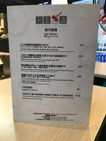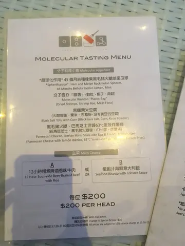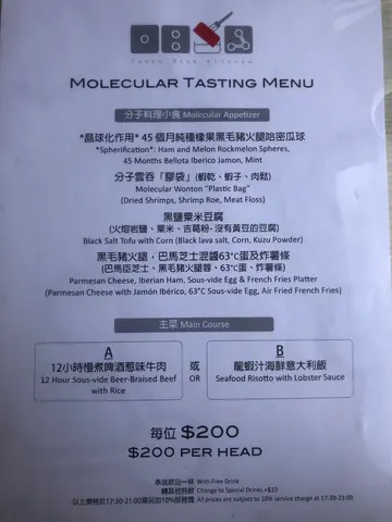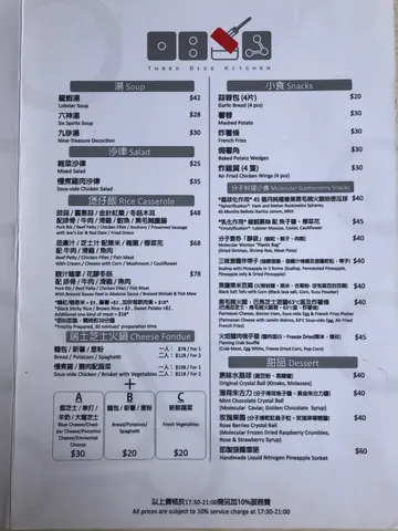 记得几年前分子料理在香港很火热,是个个都谈论的话题,当时一直想试但认识并不多,身边少了朋友谈论,慢慢的之后也没有太多机会接触到了。不过,前阵子看视频发现有位明星大厨示范了如何制作叉烧分子料理,重新勾起我对分子料理的好奇心。原来现在主打分子料理餐厅已经不多,找到了这一间在湾仔的Three Dice Kitchen, 主打平民化的分子料理,所以前去一试。相比起传统厨艺,分子料理感觉更科学、更精准。像艺术品般。而这种新兴的料理技术,开发及用料往往价钱不菲,未必位位食客都负担得起。餐厅在露天位置,幸好选择了晚上来到这里用餐,刚好避过了浪潮攻击。Full dinner set: 头一道份子料理哈蜜瓜分子晶球配西班牙黑毛猪火腿, 如果不告诉我全名,我该会认为自己是在吃著一口蛋黄配火腿。然后是份子云吞胶袋玩味再提高,它其实是以食用「胶袋」包住虾干,虾子,肉松。正确食法是先喝一口汤,再吃「胶袋」,原来感觉像吃云吞。黑盐粟米豆腐,口感像豆腐,味道则是带点咸咸的粟米糕点。黑毛猪火腿喝薯条泡在63度的蛋和巴马芝士,这个的惊喜感较普通。经过了份子料理小食的惊喜后,回到正常的主菜,2小时慢煮牛肉,味蕾还没有回到正常的轨道。喝一口用干冰形造出烟雾效果的热情果Soda,才开始习惯过来。份子料理,是一次新奇的味蕾探险记。…查看更多