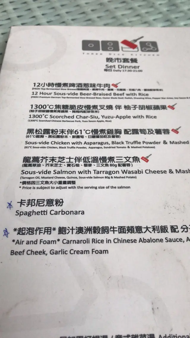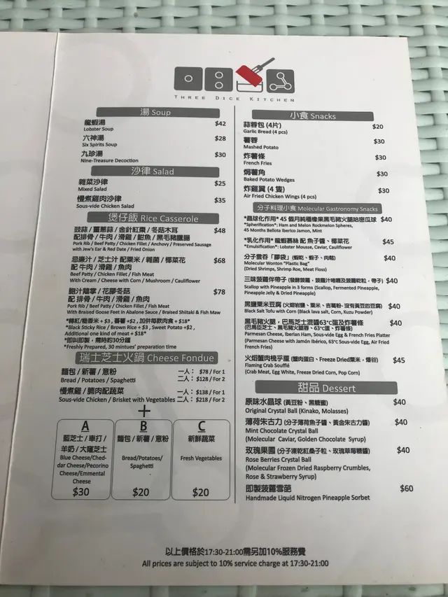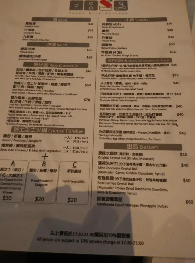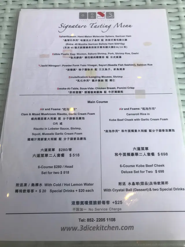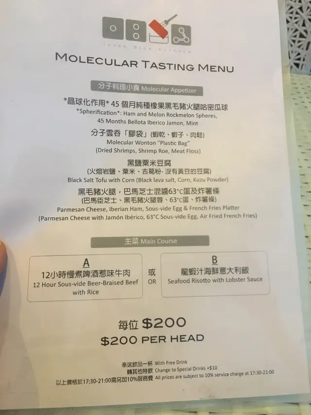 記得幾年前分子料理在香港很火熱,是個個都談論的話題,當時一直想試但認識並不多,身邊少了朋友談論,慢慢的之後也沒有太多機會接觸到了。不過,前陣子看視頻發現有位明星大廚示範了如何製作叉燒分子料理,重新勾起我對分子料理的好奇心。原來現在主打分子料理餐廳已經不多,找到了這一間在灣仔的Three Dice Kitchen, 主打平民化的分子料理,所以前去一試。相比起傳統廚藝,分子料理感覺更科學、更精準。像藝術品般。而這種新興的料理技術,開發及用料往往價錢不菲,未必位位食客都負擔得起。餐廳在露天位置,幸好選擇了晚上來到這裏用餐,剛好避過了浪潮攻擊。Full dinner set: 頭一道份子料理哈蜜瓜分子晶球配西班牙黑毛豬火腿, 如果不告訴我全名,我該會認為自己是在吃著一口蛋黃配火腿。然後是份子雲吞膠袋玩味再提高,它其實是以食用「膠袋」包住蝦乾,蝦子,肉鬆。正確食法是先喝一口湯,再吃「膠袋」,原來感覺像吃雲吞。黑鹽粟米豆腐,口感像豆腐,味道則是帶點咸咸的粟米糕點。黑毛豬火腿喝薯條泡在63度的蛋和巴馬芝士,這個的驚喜感較普通。經過了份子料理小食的驚喜後,回到正常的主菜,2小時慢煮牛肉,味蕾還沒有回到正常的軌道。喝一口用乾冰形造出煙霧效果的熱情果Soda,才開始習慣過來。份子料理,是一次新奇的味蕾探險記。…查看更多