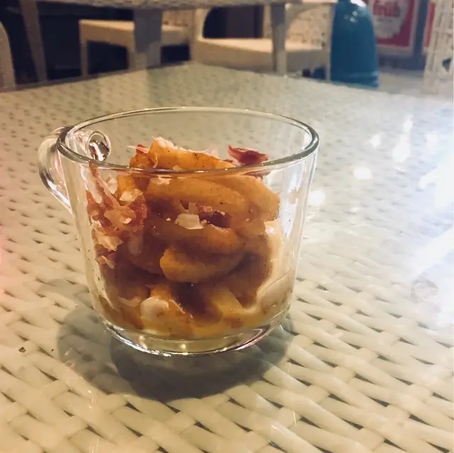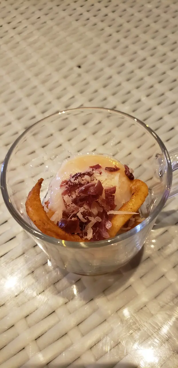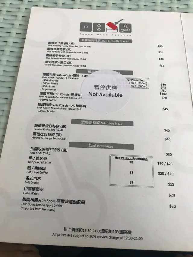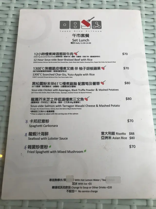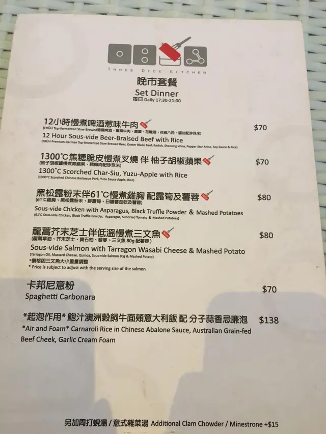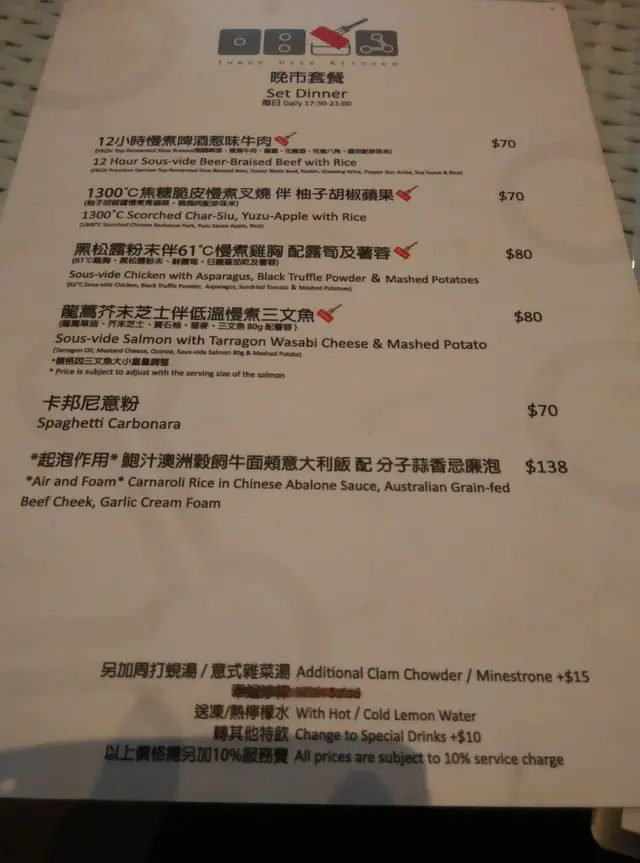 記得幾年前分子料理在香港很火熱,是個個都談論的話題,當時一直想試但認識並不多,身邊少了朋友談論,慢慢的之後也沒有太多機會接觸到了。不過,前陣子看視頻發現有位明星大廚示範了如何製作叉燒分子料理,重新勾起我對分子料理的好奇心。原來現在主打分子料理餐廳已經不多,找到了這一間在灣仔的Three Dice Kitchen, 主打平民化的分子料理,所以前去一試。相比起傳統廚藝,分子料理感覺更科學、更精準。像藝術品般。而這種新興的料理技術,開發及用料往往價錢不菲,未必位位食客都負擔得起。餐廳在露天位置,幸好選擇了晚上來到這裏用餐,剛好避過了浪潮攻擊。Full dinner set: 頭一道份子料理哈蜜瓜分子晶球配西班牙黑毛豬火腿, 如果不告訴我全名,我該會認為自己是在吃著一口蛋黃配火腿。然後是份子雲吞膠袋玩味再提高,它其實是以食用「膠袋」包住蝦乾,蝦子,肉鬆。正確食法是先喝一口湯,再吃「膠袋」,原來感覺像吃雲吞。黑鹽粟米豆腐,口感像豆腐,味道則是帶點咸咸的粟米糕點。黑毛豬火腿喝薯條泡在63度的蛋和巴馬芝士,這個的驚喜感較普通。經過了份子料理小食的驚喜後,回到正常的主菜,2小時慢煮牛肉,味蕾還沒有回到正常的軌道。喝一口用乾冰形造出煙霧效果的熱情果Soda,才開始習慣過來。份子料理,是一次新奇的味蕾探險記。…查看更多
