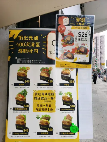 下午茶时间心血来潮想食吐司,估唔到元朗都有间吐司店,店家标明吐司内嘅炒滑蛋系「400次滑蛋」,感觉应该好滑,即刻吸引到我试!今次叫嘅吐司系「烟三文鱼+牛油果+400次滑蛋」,吐司个出乎预期地脆口,带有蜜糖嘅香甜,少少似BBQ个种牛油蜜糖烧方包,好有惊喜!400次滑蛋果然好香滑,未食之前已闻到蛋香,非常值得一试。略有不足系牛油果略生,唔够熟,但整体都唔错的~星期一至五买吐司,仲送薯饼同饮品,总共$50,抵食👍🏻