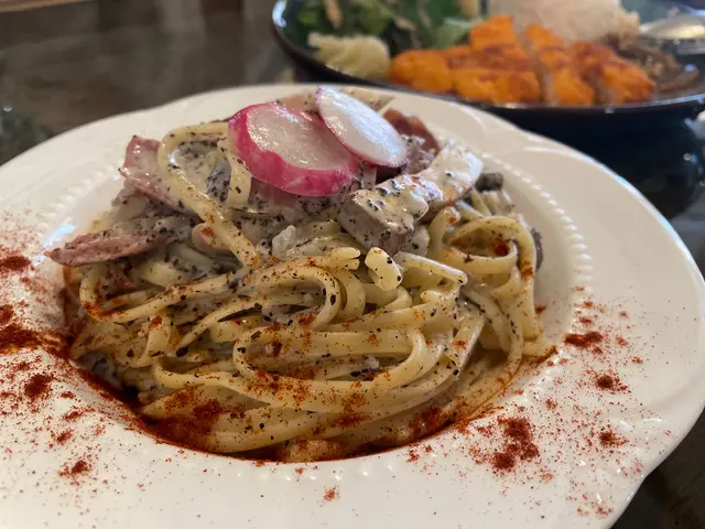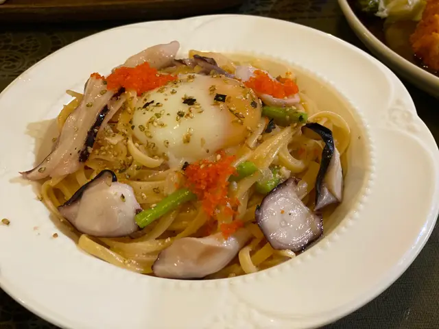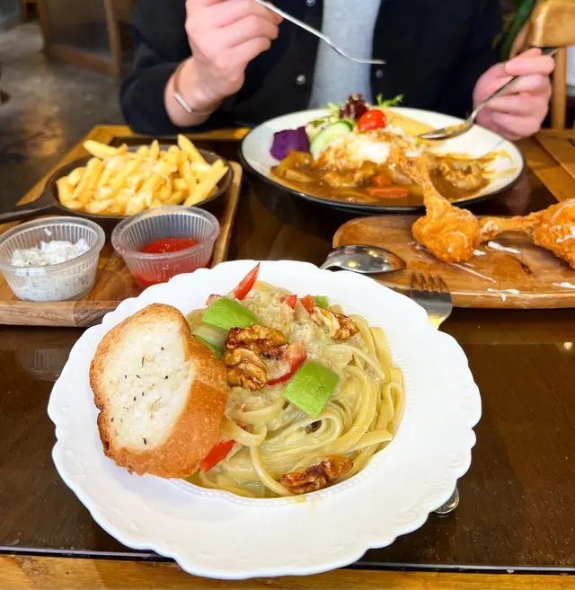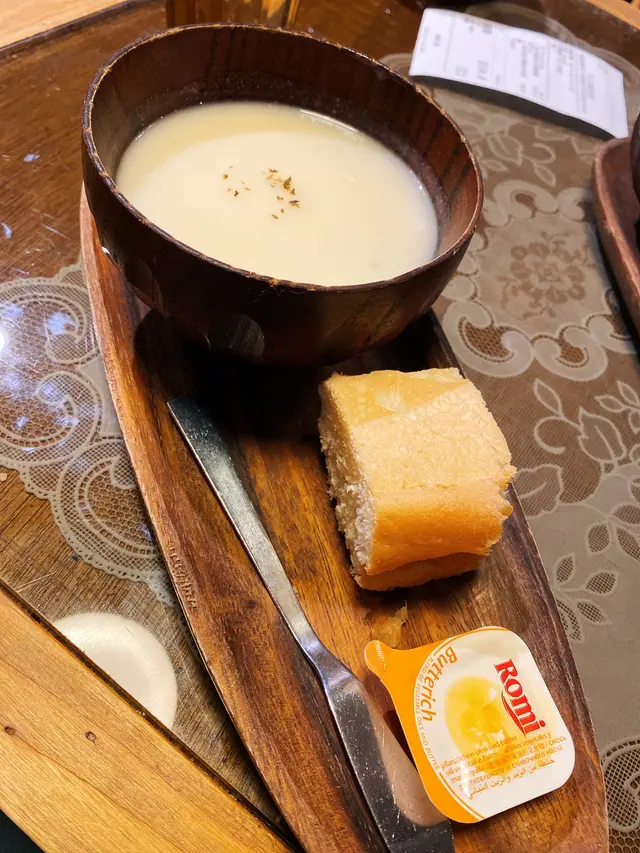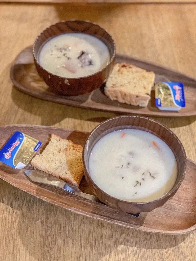 Cafe嘅佈置偏向文青同日式嘅風格🎎而坐位就唔係好多🪑想食嘅話盡量早d到🙌🏻但都坐得嘅舒服嘅🙆🏻♀️🔺前菜🫕(湯加包)唔記得咗係咩湯🥺但記得個人唔太鍾意🤭覺得有少少水🥴包🍞係莓嘅包,不過不失💁🏻♀️🔺鹹蛋黃醬帶子意大利粉🍝$88好奇加上本身鐘意鹹蛋黃就想試吓😗配料有4粒帶子同頗多蘆筍🥬但鹹蛋黃醬加意粉講真個人覺得有d奇怪🥴有少少唔太夾😶食一兩啖都ok但食多幾啖就真係麻麻啦😌…查看更多