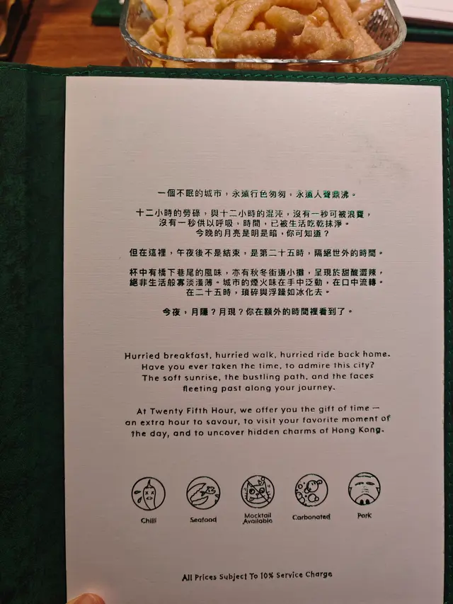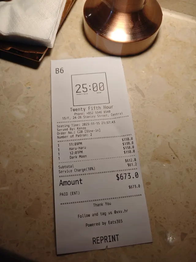 Twenty Fifth Hour (中环) 网址: https://s.openrice.com/QrLS01nSB00 地址: 香港中環士丹利街24-26號13樓 电话: +852 55468540
