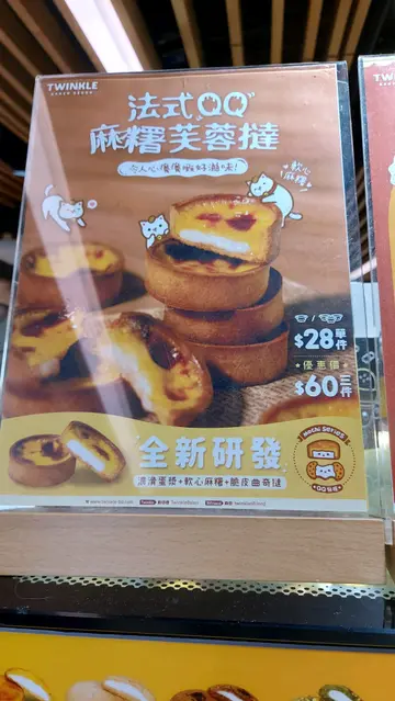 挞一共有十款拣,每件$28,$100四件。开心果麻糬挞 牛油曲奇饼底上面有开心果吉士加麻糬,面头有甜忌廉,造型好似一朵花。曲奇饼底唔够脆,牛油味都够香。开心果吉士滑溜,略嫌开心果味唔够香浓。中间粒麻糬好大粒,呢粒麻糬就令成个挞即时升级,添多一重口感。绿茶麻糬挞绿茶麻糬挞就变左绿茶吉士加绿茶忌廉,呢个挞绿茶味好香浓,我觉得好食过开心果麻糬挞。绵绵软心芝士挞绵绵软心芝士挞就貌似系最普通,不过价钱一样。但系唔知点解呢个挞个挞皮系最脆口!入面芝士非常浓厚香滑带芝士咸香,虽然无其他料,但系喜欢芝士甜品人士应该会好钟意!总括而言,挞地呢个价钱呢个质素可能都系咁上下,可以再好d。有多d配料既挞作为散水饼都唔失礼人,可以考虑。