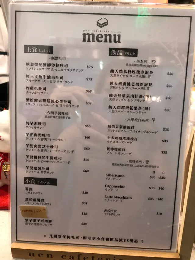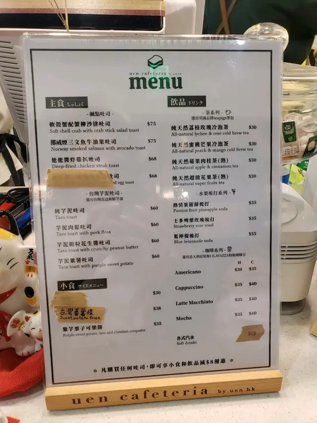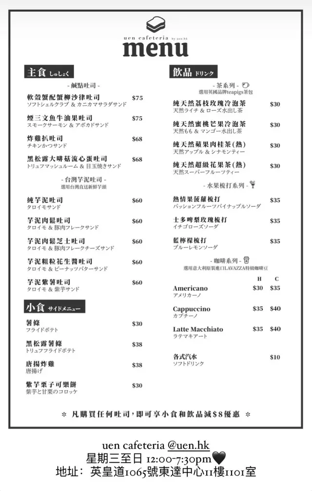 uen cafeteria (太古) 网址: https://s.openrice.com/QrLS0Lys500 地址: 香港太古英皇道1065號東達中心11樓101號舖 电话: +852 61670490