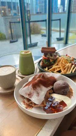 星期日3点几去到都要等一阵位,不过都好快入座,坐咗系近门口啲嘅位,唔会好似入面咁同其他人坐好近,但就会成日有人系前面行黎行去🤣🍔Waffle Burger with Sous Vide Short-Rib牛小排肉质都算嫩,但唔知点解冻冻地,加埋山葵酱食系几夹嘅,有埋薯条同沙律,个人认为沙律啲酱少酸😅依个Burger 嘅窝夫就干身少少嘅🧇Chocolate Waffle拣返普通嘅朱古力味,上面个层麻糬暖暖地好烟韧,觉得唔错😋下面有4件窝夫,口感偏腍,底下有层香蕉酱,都几香,可以连埋个比利时朱古力雪糕一齐食,前面个啲黑糖啫喱就无特别无咩味☕️(Hot) Flat White正常发挥咖啡味好够浓🍹焦糖抹茶海盐奶盖好饮,焦糖味好香但又唔会好甜,可能中和返抹茶本身有嘅少少苦味,上面薄薄嘅一层海盐奶盖比想像中出色~…查看更多