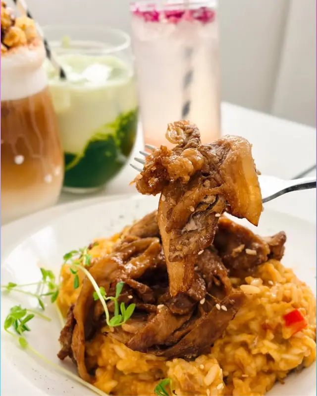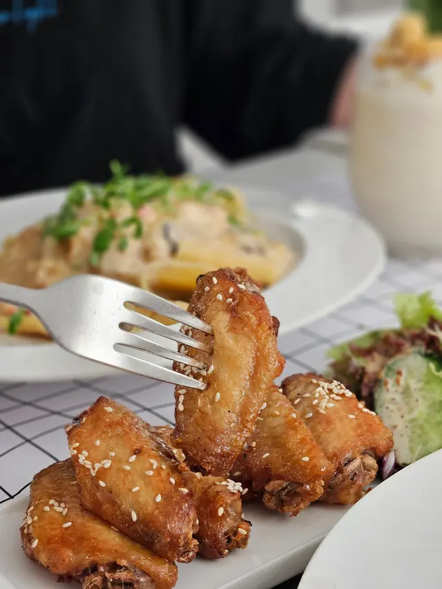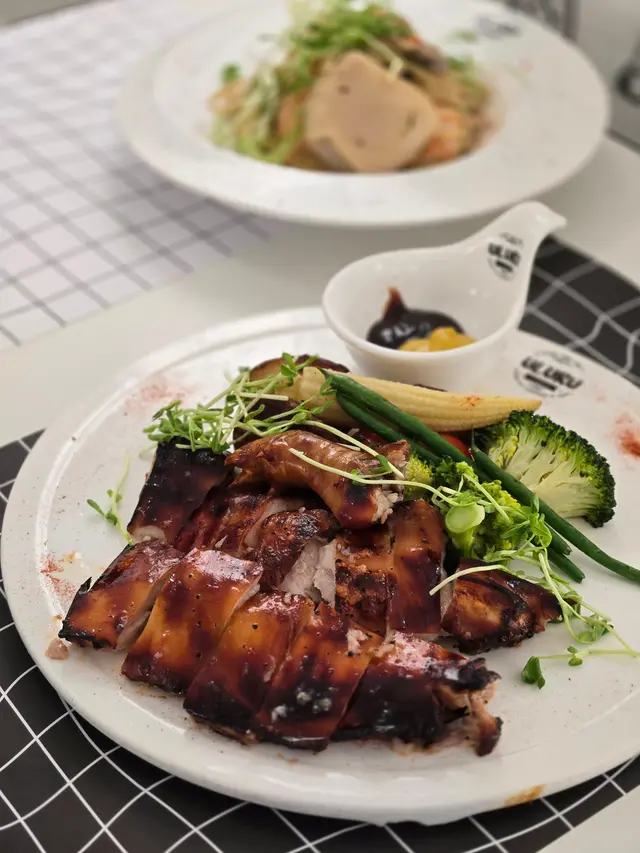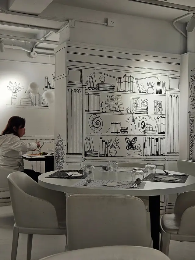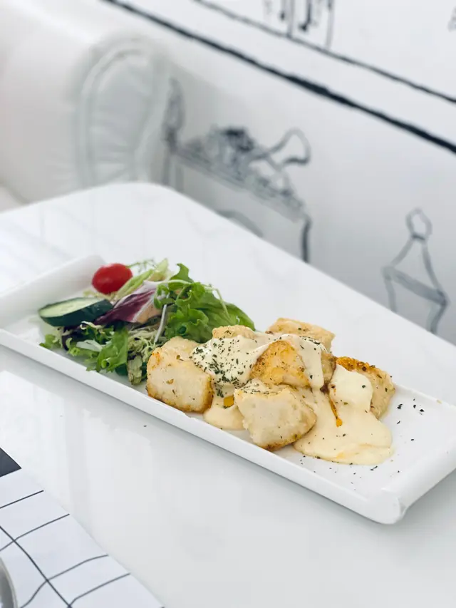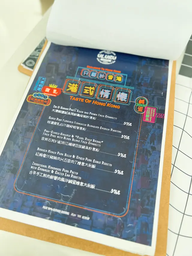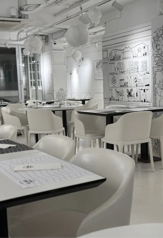 第一次嚟呢間黑白得咁純粹嘅餐廳,如果唔係朋友介紹,都唔知灣仔有一間人氣爆燈嘅樓上鋪Cafe,平日去都有八成滿🫣走過長長嘅樓梯,就會到達餐廳,餐廳呈呂字形,在餐廳走過通道進入神秘嘅空間。小食其實有唔少嘅選擇,保守啲就揀咗「蜜汁焗雞中翼 」中規中矩,是一道唔錯嘅開胃菜!😝如果未食就一定會懷疑佢呢張Menu-「港式情懷」🤔啲菜名加埋好似唔係太match咁🥸「大澳蝦醬魷魚筒鮮鳳尾蝦炒意粉」未食之前就諗緊真係會match嘅咩?大澳蝦醬平時應該用嚟炒通菜,有印象都知道佢鹹鹹地,從來冇諗過嘅嘢,原來同炒意粉有幾match!「紅燒蜜汁豬腩肉片五香肉丁燴意大利飯」淨係個名都水蛇春咁長😝唔知大家有冇食過五香肉丁炒飯,五香肉丁燴意大利飯就有呢種感覺,不過個味道就冇炒飯咁鹹,反而用嚟燴飯幾有特色,又係一個估唔到咁match嘅組合!紅燒蜜汁豬腩肉片,我會形容佢好大塊,蜜汁都好香濃🥸其實兩個主食都幾飽下,二姑媽話見到「富士芝櫻祭-丸久小山園抹茶 Tiramisu 」=Lava🌋okok 明嘅明嘅,即刻安排上😏丸久小山園抹茶Tiramisu,個芝士好滑,又唔會話太膩,反而嘅欣賞佢嘅火山灰,用咗玫瑰花磨碎+威化餅碎,扮火山灰,一嚟個意境到,二來係match埋Tiramisu 一齊真係幾好食😛我就比較偏愛「MANGO POMELD SAGO」,顏色好靚,有層次,係冬天飲沙冰凍咗少少🥶✦ 蜜汁焗雞中翼 $88✦ 大澳蝦醬魷魚筒鮮鳳尾蝦炒意粉 $158✦ 紅燒蜜汁豬腩肉片五香肉丁燴意大利飯 $168✦ 富士芝櫻祭-丸久小山園抹茶 Tiramisu $118✦ VIRGIN PEACH MOJITO $68✦ MANGO POMELD SAGO $68…查看更多