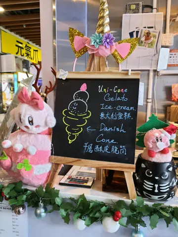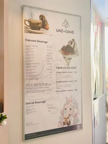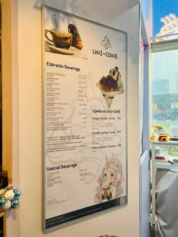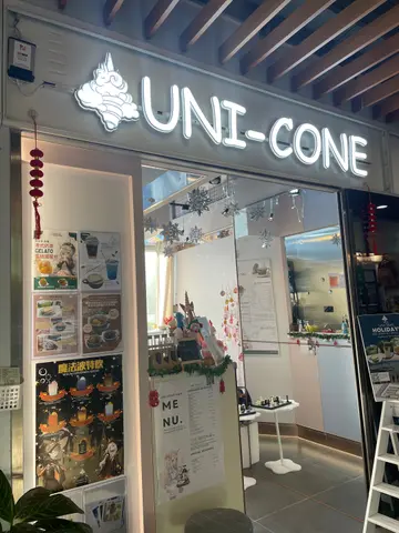 圣诞假期时我带宝贝女去石门的绿在区区回收家居废物,准备搭铁路前个女话想食雪糕,我就带佢行京瑞广场,行行吓见到有间店的海报有点吸引就光顾。当我想点极吸引的雪糕菠萝包时,店员表示只在星期六、日供应,平日才DAY OFF的我感觉有点可惜>.<而餐饮反而我想饮热饮,因为我本身食雪糕想用暖饮中和吓~~~宝贝女就点咗 signature uni-cone,士多啤梨雪芭配上朱古力酱,手握半件牛角包可以食落肚,宝贝女大赞好味