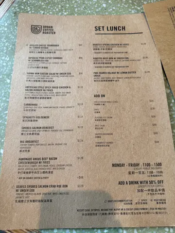 Tucked away on Kingston Street, Urban Coffee Roaster is the lovechild of 2 coffee enthusiasts who pride themselves sourcing, roasting, and brewing expertise. I asked for a place to work, and they provided a place for me to charge my laptop along with free wifi. This place doesn't seem to have a time limit for customers which is an extremely rare find especially in Hong Kong, which gives this place a big plus for me.Today I tried a hefty serving of beef rice, tomato soup, some granola oats, a latte and a 85% iced chocolate, which was slightly more expensive than the average meal, but still a decent price for the premium ingredients you get. What stood out to me the most were the tomato soup and the chocolate, where I tasted both the richness and the quality instantaneously. I really liked the presentation of the chocolate soup in particular, where the square ice cube and the shavings of dark chocolate made it look like an elegant cocktail. The oats were just as great in my opinion, and the fruits that came with were just as fresh and juicy. The latte was nice too, since the balance between bitterness, sweetness, and milkiness complemented each other in a wonderful aroma, a testament to UCR's promise in using "freshly roasted specialty coffee beans." The only semi let down was the beef rice, as there was no medium or medium-rare option for my beef, and some parts of the rice were still a little bit uncooked. But overall, I really enjoyed my meal and the dinning atmosphere for the 3 hours I was here, and the staff were nice, diligent, and super attentive.…查看更多