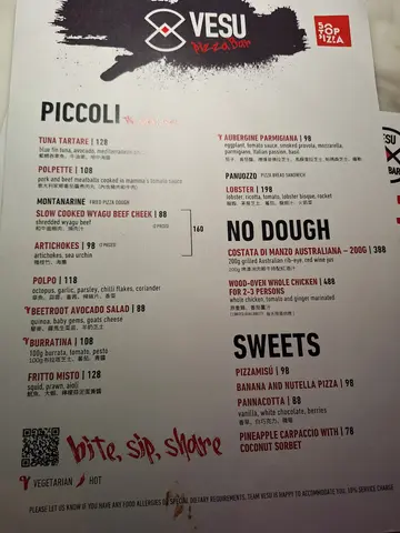 Vesu pizza bar is another restaurant that is the top 50 pizza in Asia. We definitely ordered many pizzas including even their desserts.It was lovely to enjoy the view at both sides of the restaurants.Fried pizza dough was chewy and the toppings despite not a lot, was rich in flavors.The pizza were Neapolitan pizza. The crust was really thin and their homemade sauces for both of these fusion pizzas really popped up. The charred edges also gave it a distinct aroma.The lobster pizza sandwich gave a similar style to the pizza but in another format.The proteins were good but slightly paled compared to their star pizzas.Both desserts had their base made from pizza. Though both tasted great, I preferred the banana and nutella more. There were really a lot of banana for this dessert and the moist banana matched the pizza bit better. The pizzamisu was a nice twist to the tiramisu but the powdery top together with the pizza base made it a bit difficult to have without a making a mess.…查看更多