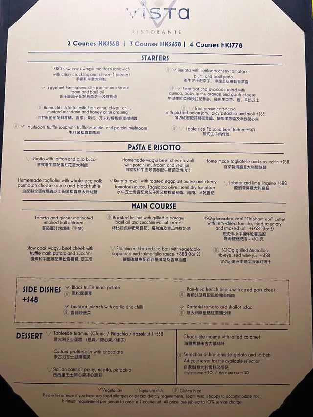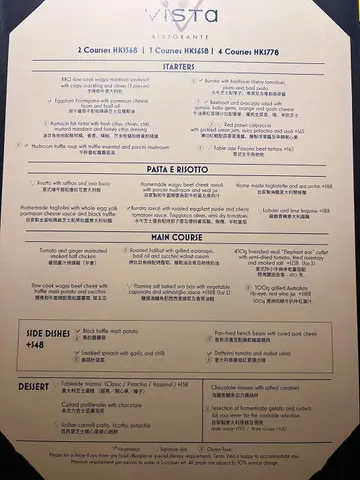 嚟到餐厅真系「哗」一声,张张餐枱位置都可以睇到港岛区的维港风景,慢慢叹过周末午餐,正!Vista「周末风车午餐」午餐包括:Margherita Pizza 一片、迷你蘑菇汤(份量都唔迷你)、自选五款开胃菜、主菜及一个甜品。风车午餐的精粹是自选5款开胃菜,选择了:Burrata 布拉塔芝士沙律、烤八爪鱼配鹰嘴豆蓉、迷你鹅肝挞、生带子薄切、蓝鳍吞拿鱼配牛油果他他。款款都好食,最钟意Burrata 布拉塔芝士沙律,份量大,味道都好正宗,有种处于意大利嘅感觉。蓝鳍吞拿鱼配牛油果他他有啲日本+西式现代fusion,好香滑,如果加多一两片柠檬在旁,可以自行调配柠檬汁份量,味道会更清新。主菜拣咗:慢煮和牛面颊配松露薯仔蓉及青瓜、西西里海鲈鱼柳。慢煮和牛面颊带点烟靭感,不会很油腻,而且份量也很足够。松露迷对住松露薯仔蓉咁香松露味,忍唔住不断食。青瓜🥒原来整咗上面𠮶两块好似薯片咁脆嘅脆脆片。洒上薄盐香煎的西西里海鲈鱼柳,带点中式煎鱼感觉,配了烩蕃茄杂菜,轻盈不油腻。最后的甜品:经典意大利芝士蛋糕 Classic Tirmaisu,份量都几大份下。外型都入面的馅饼一点都不马虎。$488 嘅餐牌食物款式和份量都好丰富。如果加埋海鲜拼盘嘅话,相信要由12点食到3点,唔停咁食足3个钟😂 价钱同中上环soho 区的西餐厅相约,而呢度仲有海景睇!平时嘅工作压力、生活压迫,难得可以慢慢享用美食,欣赏维港风景,放空下,真系好减压、好写意。Vista呢间海景餐厅,观赏维港烟花庆祝活动等风景一绝。临走前问咗职员,如要预订观赏维港烟花庆祝节日的晚餐要几耐前订位,职员告知最好于烟花活动前一个月订位。…查看更多