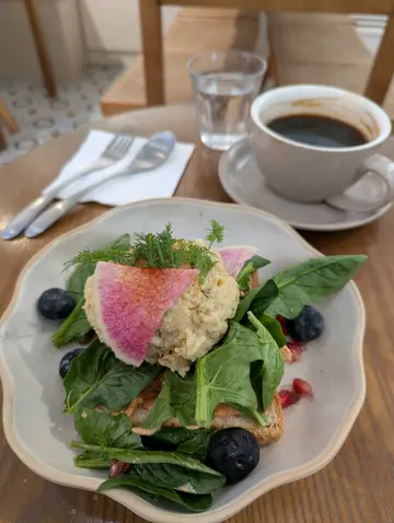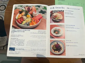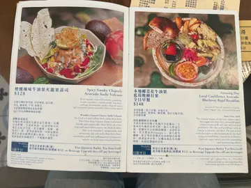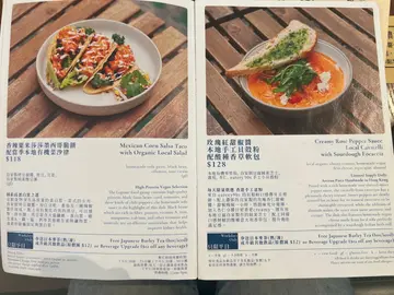 本地椰菜花牛油果蓝莓酸种贝果全日早餐材料好多。蓝莓Bagel好大个,食落好脆,唔难咬,唔会好韧,可以点送上嘅自家制蓝莓果酱。其他材料都丰富,颇多沙律菜,酱汁淡淡地,味道温和唔会太酸太甜。魔芋整嘅三文鱼粒粒,质地软软几得意。烤Brussels sprout好味。唯一可惜系焗薯同焗天贝都有啲㶶,带点烤焦苦苦地嘅味道。👌🏼 开心果青酱手工意大利云吞配酸种香草软包 $138因为系素食,所以呢度嘅青酱同平时食开果种唔太一样,系比较甜嘅味道同开心果味,少咗𠮶浸咸香嘅芝士味。Basil 味道都充足。意大利云吞入边系一啲蘑菇,上面有啲扮芝士嘅豆腐,加埋合桃碎增加粒粒口感。Broccolini 烤得干身又爽甜。👌🏼牛油果三文鱼香芒刁草薯仔沙律蓝莓酸种贝高全日早餐 隔一阵再嚟,全日早餐嘅材料又唔同咗。依然材料好丰富,仲有d exotic d 嘅材料例如天贝,燕麦奇亚籽杯等。餐牌写住厨师最爱薯仔沙律,但系反而我麻麻哋,唔钟意𠮶浸酸味。其他材料都还可以。依然有魔芋整嘅三文鱼粒粒,质地软软几得意。🤔本地有机白菌栗子浓汤虽然名字叫“浓汤”,但个质地唔系想像中咁浓稠,反而比较水。亦都冇咩栗子味,只系好淡好淡嘅蘑菇味,仲有少少好轻微嘅酸味。