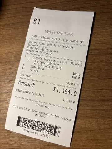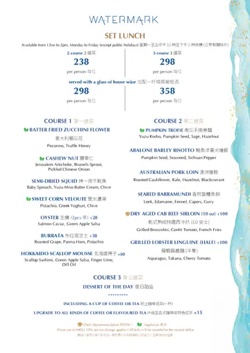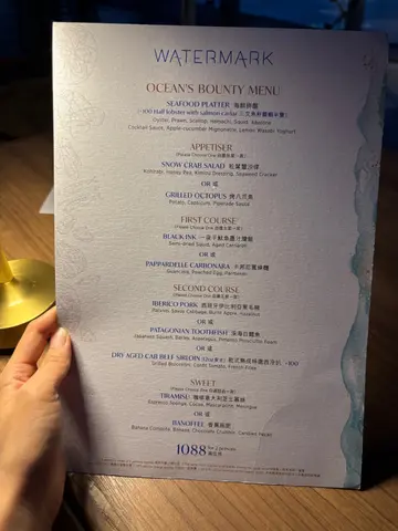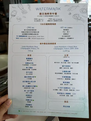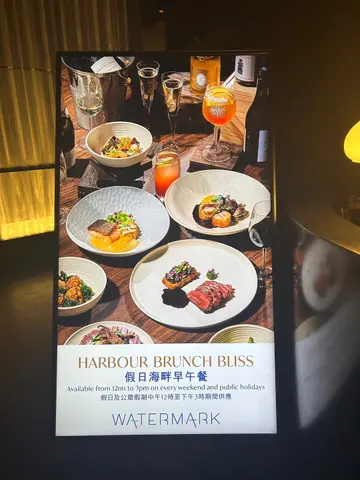 早前与好友到中环Watermark来个周末brunch, 于舒适的环境享受美食, 微醺之中度过愉快周末. Brunch共有前菜11款、主菜7选1、甜品拼盘.270度海景, 每张枱距离宽阔, 楼底高, 就算多客都不会太嘈吵. 看到菜单, 已经好期待. 喜欢鹰咀豆蓉的话, 这份开心果鹰咀豆泥酱都算幼滑, 又有新鲜无花果及芫茜, 配搭新颖. 酸种面包配紫菜牛油, 非常高质! 酸种是有一种吸引力, 外脆而内有少少烟韧, 而紫菜牛油好香口, 涂了很多在包上. 这个presentation挺好, 很配合海景餐厅~ 浅渍油甘鱼够油润, 入口顺滑, 点睛之处是牛油果慕丝及三文鱼鱼籽, 增加咸鲜. 带子慕丝是切得小件, 伴以青苹果莎莎酱及手指柠檬, 是清淡清新.相比之下, 和牛他他就相对地十分浓味, 可能是伴了金山寺味噌~ 没有吃太多, 反而迅速被其他美食吸引. 必食渍红菜头沙律, 混了八珍甜醋, 吃起来是酸甜有度, 开胃清爽. 金菜头尤其清甜. 有芝士及饭素加持, 令这份迷你罗马生菜沙律变得极为吸引, 咬下的清脆爽甜, 让我们再order. 烤一夜干鱿鱼配枝豆及紫苏, 这个比预期中的软稔, 若果爽口些会较好, 味道是对办.烤椰菜花, 外形似极大的爆谷~ 伴了甜酸醋栗, 咬下爽口, 也不错~ 期待已久的烤猪腩肉来啦~ 的确没让我们失望, 肥瘦适中, 脂肪位置都被烤得香脆, 沾了甜椒酱、紫苏叶及辣椒来吃, 好好味~ 翠绿的西兰花苗也让菜式也为菜式加分. 由于我们一枱人, 所以就能点不同主菜来分享, 例如烩牛面颊肉, 含丰富胶原蛋白及结实的肌纤维, 因为吃起来是软嫩带黏糯, 非常滋味. 伴碟薯泥十分香滑, 又伴了牛肉汁, 很完整. 虽然要加HK$220, 但这份烤原只波士顿龙虾很推介! 添了西京味噌, 鲜味十足, 龙虾身弹牙, 虾钳软滑, 超赞.另一款要加钱的是M7和牛后腰肉 (加HK$120), 五成熟, 肉味香浓, 四边煎得香口而中心肉质嫩滑. 就连法式薯批都几有睇头, 混了蚕豆、羊肚菌、焦糖洋葱及牛肉汁, 所以味道几复杂. 个人也很推介松叶蟹义面, 先说面质弹牙, 拌了巴马臣芝士、盐渍柠檬及龙虾汁, 整体几开胃, 可以自己一人吃光也不是问题. 朋友很喜欢这道法国黄油鸡, 烤得金黄, 好惹味~ 伴碟是幼滑的烟肉香葱薯泥、少见的黑皮鸡枞菌、炸羽衣甘蓝, 整个配搭非常得宜. 甜品拼盘就是按人数的, 这是三人份量. 6款甜品分别是绿茶tiramisu、香蕉朱古力蛋糕、macaron、芝士蛋糕等.再来一杯咖啡, 真的很满足啊~ 周末Brunch - 成人每位HK$598+10%(包一杯咖啡或茶); 小童(4至10岁)每位HK$250+10%(轻量版主菜、无限畅饮汽水及果汁)也可考虑加钱享150分钟无限畅饮, 例如每位加HK$60就可享杂果宾治、汽水、果汁、青柠梳打、咖啡或茶、矿泉水. 想喝酒精, 不妨每位加HK$290 享气泡酒、Chardonnay 白酒、Pinot Noir 红酒. …查看更多