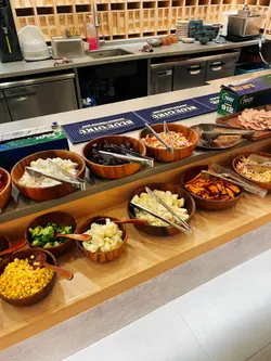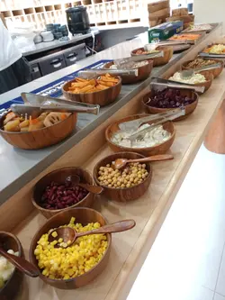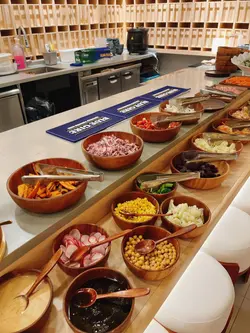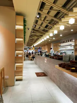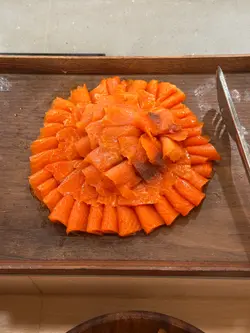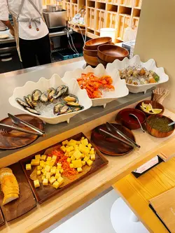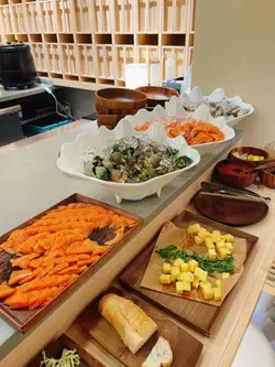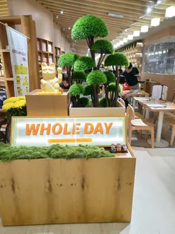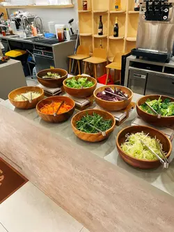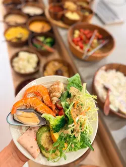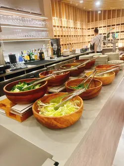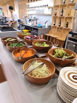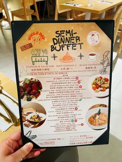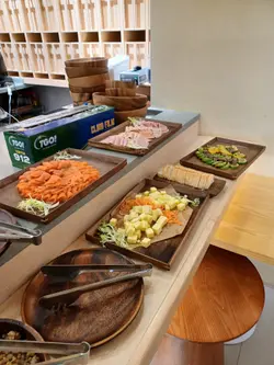 今天来到大围围方逛商场后到一间开业不久的西餐厅吃[半自助午餐]:包括了自助沙律吧+主菜+汤+咖啡/茶。餐厅装修簇新,简约时尚,光洁亮丽,坐得舒适。自助沙律吧选择非常丰富:有十多款新鲜蔬菜、沙律及前菜,还有冷切肉盘、烟薰三文鱼、芝士等,非常丰富。我最爱吃三文鱼,这里的三文鱼新鲜爽口,肉质细嫩,入口甘香。单吃沙律已经可以吃过饱!主菜:「宝云酥小羊柳配意式忌廉玉米蓉」