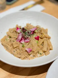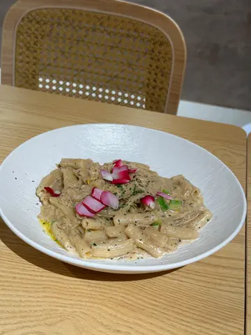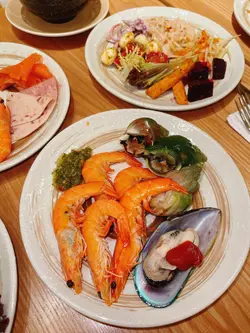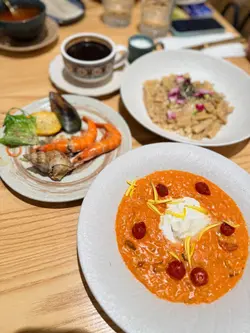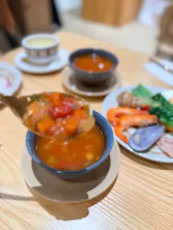 卖相一样不俗。烤香大虎虾,肉质弹牙,味道鲜甜。配上龙虾汁的阔条面,非常入味,蔫韧弹牙。餐汤:杂菜汤酸酸甜甜,非常开胃。餐饮:意式咖啡