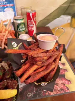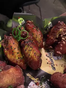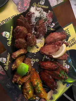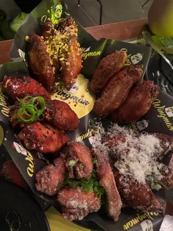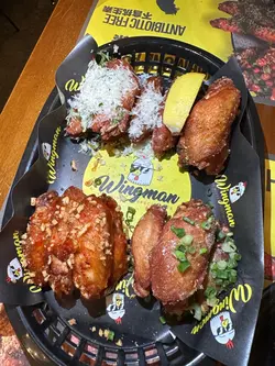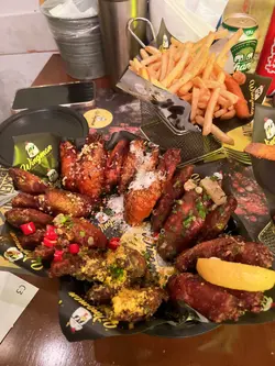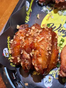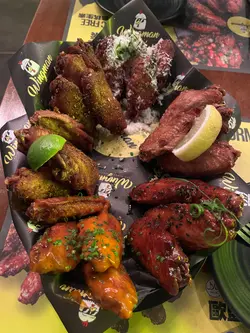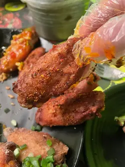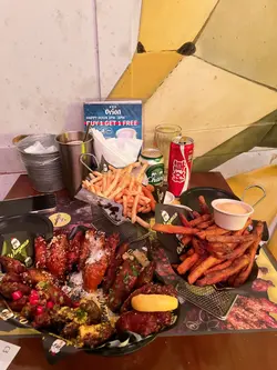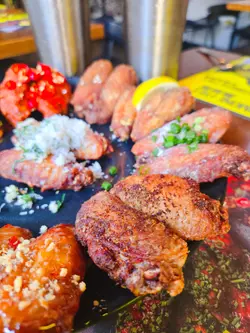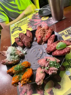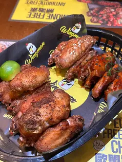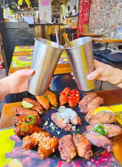 餐廳有一邊是用卡式帶作裝飾的牆,另外有用霓虹燈寫着「一起叫雞」的字,貼切得來又有趣唷!一個價錢一口氣可以試盡10種口味的雞翼,而且雞翼是用上不含抗生素,無激素的歐盟認證走地雞,質素有保證,吃得更加安心呢!雞翼拼盤送上桌面時賣相非常吸引,看得我們都口水直流啊!雞翼外皮帶點香脆,但不會覺得太油膩,內裏還帶點肉汁。第一次下單,我們把10種口味的雞翼都點了,每一種口味都嚐一下,第二輪就挑選了一些我們比較喜歡的口味,例如是加州風味,由大蒜、歐芹、帕爾馬芝士調製而成,味道滋味!以及泰式甜酸醬,整隻雞翼佈滿醬汁,表面灑有炸蒜,十分惹味!而喜歡吃辣的一定不要錯過死神醬口味,我吃幾口已經吃不了,餐廳🌶️🌶️🌶️辣椒圖案有三個,辣度絕對足夠唷!.除了雞翼之外,飲品汽水也是可以任飲的,我們不用90分鐘都已經把肚子填得滿滿的啊!吃得非常滿足~.⏱️限時90分鐘💰星期一至四$188💰星期五至日$208