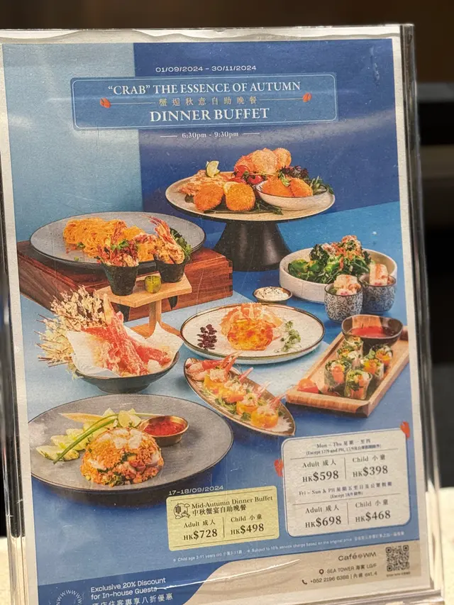 ❗️召集所有蟹迷❗️🦀📣 Café@WM新推出「金秋蟹香自助晚餐」主題 buffet♥️ 以蟹為主角,結合了多國料理風味,蟹香四溢! 今晚同家人食得好滿足好開心!從環境到食物都堪稱完美,絕對是香港秋季必試的 buffet 選擇!-Café@WM 位於 WM 酒店內,餐廳空間寬敞明亮,座位間距充足,用餐過程舒適自在。落地玻璃配合柔和的燈光映襯著窗外夜色,營造出浪漫而放鬆的感覺-♥️蟹香主導,多樣創意的秋季海鮮盛會「金秋蟹香自助晚餐」以蟹為主角,食材新鮮多樣,融合中西日風味,讓我從開胃菜到甜點都吃得欲罷不能🔸晚餐時段從下午6:00 到 9:30,buffet 區分為海鮮區、熱食區、壽司區和甜點區,每區都強調蟹元素,份量充足-♥️蟹王稱霸,新鮮蟹肉的極致享受🦀 加拿大松葉蟹腳堆得滿滿,蟹腿粗壯多汁,配以檸檬汁,吃起來鮮甜不膩,絕對是蟹迷的天堂🦀法國麵包蟹:蟹膏豐盈爆滿,蟹肉細膩嫩滑,輕輕撥開蟹殼,蟹膏如熔岩般湧出,帶來濃郁的海鮮香氣與極致誘惑🦀牛油果鮮芒蟹肉沙律 新鮮牛油果與芒果切丁,拌入鬆軟蟹肉絲,口感層次豐富,酸甜清爽解膩,完美作為開胃前菜,蟹香與果香交融令人上癮🦪 即開生蠔蠔肉肥美飽滿,表面晶瑩剔透,入口鮮甜回甘帶絲絲海水鹹香,配以檸檬片或紅酒醋提味,帶來純粹的海洋鮮味,新鮮度一流!-♥️給每位食客的驚喜🎁🔸芝士焗蟹蓋蟹肉份量豐富配上濃郁的芝士層,拉絲效果誘人。整體口感豐富,芝士的奶香與蟹的鮮味完美融合-🔸大閘蟹大閘蟹蟹黃金黃豐滿,蟹肉細嫩鮮甜,蒸熟後散發出自然的蟹香。是秋季必嘗的經典海鮮-♥️經典日式料理🔸北海道帶子蟹膏手卷🔸軟殼蟹手卷米飯Q彈,蟹肉入口即化,搭配芥末和醬油,鮮味爆發-還有各種蟹肉菜式,如蟹粉蟹肉流沙天使麵、蟹粉小籠包、明太子蟹肉海鮮酥盒、花甲海蟹粥、鐵板蟹膏蟹肉炒飯、賽螃蟹伴西蘭花等多款蟹香經典最鍾意「蟹粉蟹肉流沙天使麵」! 豐盈澎湃的蟹粉與幼滑如絲的天使麵編織成不可抗拒的魅力-♥️甜點區:秋滿月餅壓軸,甜蜜收尾甜品區排列整齊,色彩繽紛! 很多特色以茶入饌的甜品,甜度剛好🔸培茶吉士泡芙塔🔸提子烏龍茶蛋糕🔸伯爵茶牛奶朱古力蛋糕🔸桂花酒釀小丸子而當晚入座,每枱奉送「WM 秋滿月餅」。餅皮酥脆,芒果慕絲內餡清甜! 甜品選擇多達十幾款,每款都小巧可愛,讓晚餐以甜蜜結束-這次「金秋蟹香自助晚餐」不僅蟹類食材新鮮豐富,創意料理也讓人耳目一新,避免了傳統 buffet 的單調。廚師團隊用心,每道菜都注重季節感和平衡,蟹香貫穿全程,讓秋季用餐充滿儀式感…Read More