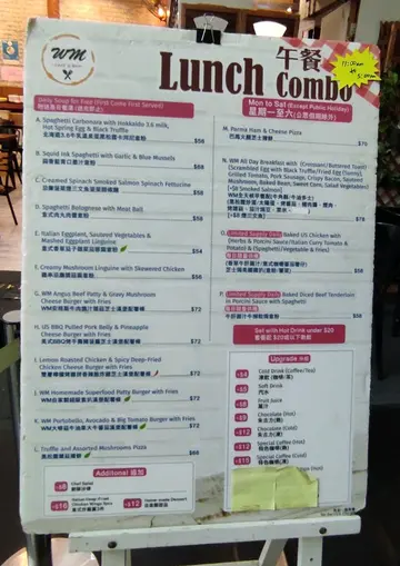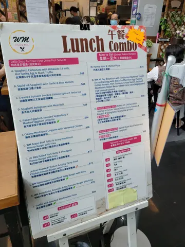 今天又驾车经过科学园,随意到一期的食肆找吃的。到了一间叫wm的,地方好细,座位不多。不过,看到午餐menu都几吸引,就试试。餐汤是蕃茄汤,用两个饮品杯盛著,有半杯满。一看,不太吸引。一饮,好酸!不过,确实有好多番茄茸沉底,真材实料,不是罐头蕃茄汤。Honey点安格斯牛肉汉堡扒炒杂菇芝士汉堡包。食品的名字好长,逐样数,就欠了炒杂菇,算啦。汉堡包好多芝麻,松软。不过,那块安格斯牛肉,好实!整个好大份,不贵。我点温泉蛋卡邦尼意粉。这个不错。汁不太浓稠,温泉蛋好嫩,意粉份量也多。最有惊喜的是,加钱追加的小食。炸鸡翼16元三只,刚炸起,好香脆,不油腻,腌得够味,但又不太咸。加12元,是日甜品:柠檬芝士蛋糕。饼底松软,芝士creamy,柠檬够酸,very nice,真抵食!追加小食比主食更出色更吸引。总体而言,尚算不错。…查看更多