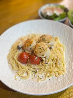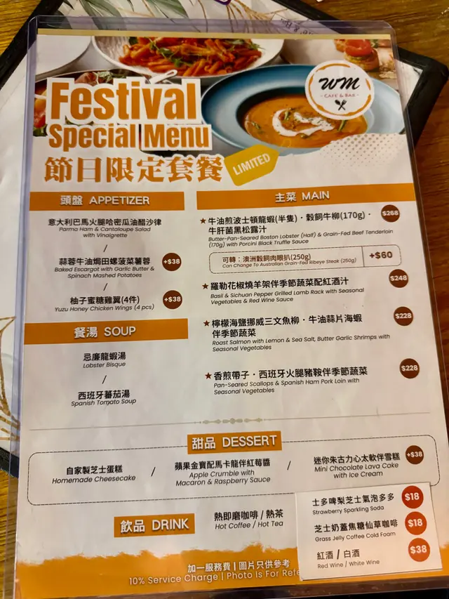 与朋友来到荃湾西铁站逛街,累了想找一间既安静又舒服,又能品尝高质食物的西餐厅。网上搜寻一间位于海之恋商场三楼的<WM Cafe' & Bar >西餐厅。我们进入食店,环境的确如我们想像中,舒适阔落,能给予食客宁静空间。除了室内座位外,还有室外海景露台座位。晚餐餐牌提供6项主菜、搭配餐汤、甜品和饮品,价钱由$168至$288。点了法式焗龙虾配红酒酱汁烤牛柳餐和青苹果牛油果酱鸡肉沙律。法式焗龙虾配红酒酱汁烤牛柳套餐(忌廉龙虾蟹肉汤 + WM自家制蛋糕 +百香果冰红茶)~牛柳虽然是七成熟,但是肉质仍保留嫩滑,有牛肉鲜味,牛肉面层有红酒酱汁。龙虾以法式烹调,铺上芝士一同烤焗,肉质弹牙鲜甜,还有薯蓉、西兰花、甘笋,非常美味。餐汤可选忌廉龙虾蟹肉汤或是日餐汤,我们选了忌廉龙虾蟹肉汤。这个龙虾汤浓郁,面层放了些蟹肉。甜品可选一件WM自家制蛋糕(例如:原味芝士蛋糕、柠檬芝士蛋糕、士多啤梨芝士蛋糕、蓝莓芝士蛋糕、开心果芝士蛋糕或巴斯克芝士蛋糕)或朱古力心太软,我们选了巴斯克芝士蛋糕。果然是自家制蛋糕,巴斯克芝士蛋糕充满著浓郁芝士香味,蛋糕质地香滑,饼底是带点咸味的麦香消化饼,非常好吃。百香果冰红茶餐饮点了夏天消暑的餐饮,果茶有助消化解油腻。青苹果牛油果酱鸡肉沙律~一大盘的沙律,嫩绿的沙律菜、车厘茄、青苹果粒、鸡肉粒,还有芝士粉,搭配酸甜沙律醋,甚为醒胃。餐厅还送赠法包薄饼~全素的香脆法包,材料有车厘茄、灯笼椒粒、橄榄和菇,意式风味,很好吃。…查看更多