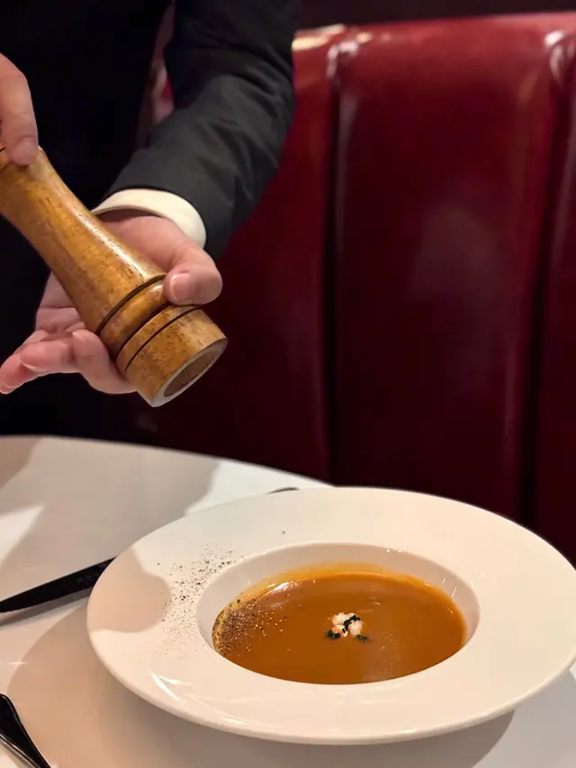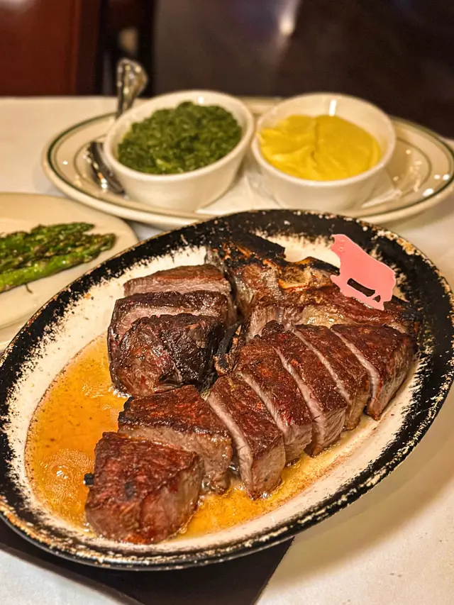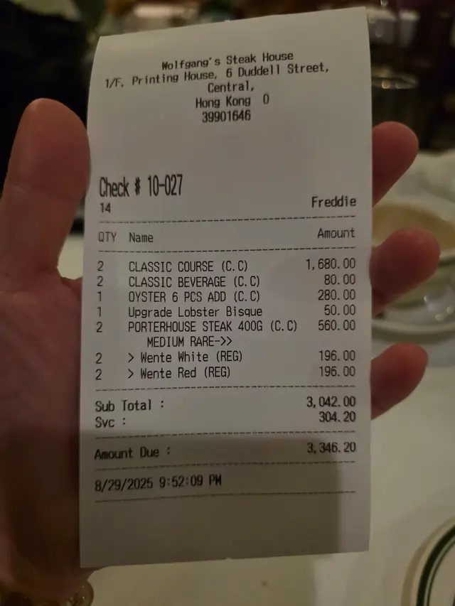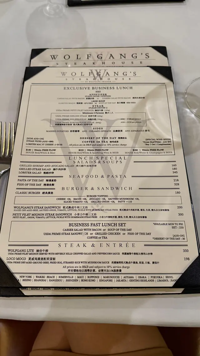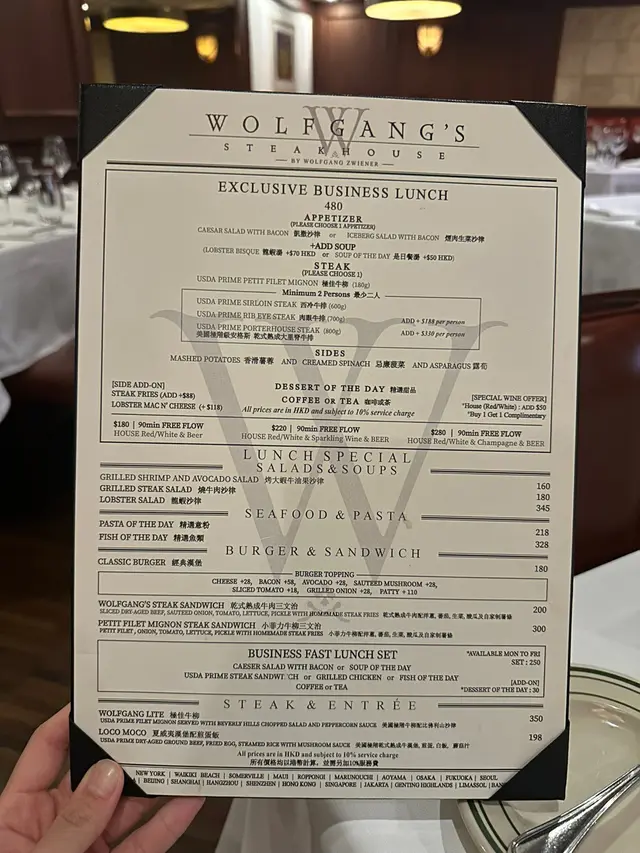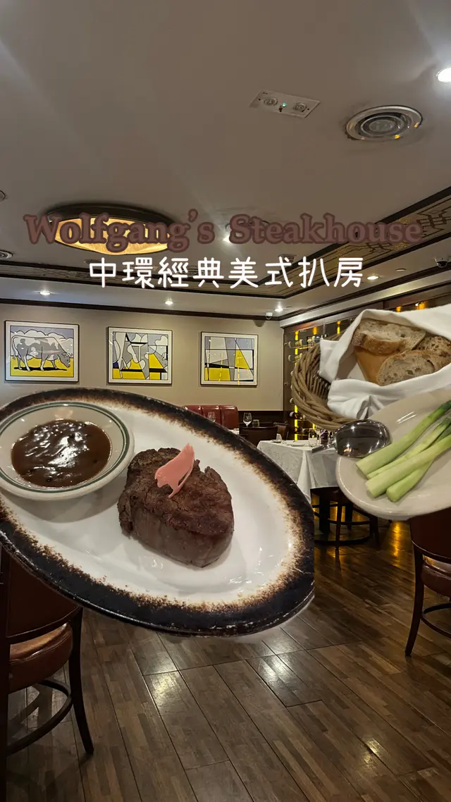 位於中環的西式扒房餐廳。本人比較老土,始終覺得慶生要拎過刀叉鋸下扒,才有慶祝的氛圍;這間傳統的美式扒房,裝潢典雅且具有空間感,帶有古典懷舊感卻不失格調。而且慶祝的時候還會贈送即影即有的留念照片,真的很適合約會或特別慶祝呢。.這間餐廳亦大有來頭,作為紐約牛扒的代表之一,採用美國認證最高規格的黑安格斯牛肉,經由空運直送到港,並在餐廳內專屬的恆溫熟成室進行28天的乾式熟成,從而提升牛肉的嫩度與風味。對牛肉愛好者來說,絕對值得一試!另外,當日餐廳非常繁忙,全場滿座,上菜速度略為慢一些;但負責接待我們的Hinson態度熱誠又親切,真的值得一讚。⋆_____ Classic Course $880/pp______⋆✿ Bread: Bakehouse's bread.✿ Appetizer: ⧐ Wolfgang's salad不喜歡吃沙律的我,也被這道色彩繽紛的沙律吸引。除了爽脆的生菜外,還有鮮甜的蕃茄、脆卜卜的煙肉粒及爽嫩的蝦肉,層次豐富,既清新又開胃。⧐ Wolfgang's crab cake招牌的手打蟹餅,份量厚實又大塊,煎至表面金黃香脆。入口後蟹肉鮮嫩多汁,每一口都能吃到濃郁的蟹肉甜味。⧐ Fresh oyster +$280選用法國Fine de Claire No. 2蠔,外殼偏淺,肉質爽嫩肥美,口感細膩多汁。搭配紅酒醋後,更能突顯蠔的鮮甜層次,入口帶有微微的榛果香氣與自然的甜味,展現海洋的純粹與新鮮。.✿ Soup:⧐ Lobster bisque +$50⧐ mushroom soup是日餐湯為磨菇湯,入口帶有蘑菇的鮮美及濃郁的菌香,質感綿滑香濃;而Lobster bisque的味道濃稠鮮甜,龍蝦的香氣突出,口感如奶油般絲滑,奢華又豐富。 .✿ Main: porterhouse steak +$280/pp⧐ Sides: Mashed potatoes / creamed spinach / grilled asparagusPorterhouse牛排由Tenderloin與Sirloi各佔一半,兩部分的肉質都粉嫩細緻,入口即化。餐廳特別採用高溫快火煎烤,然後將牛排放在已預熱的瓷碟上;當牛排送上桌時,油脂在熱度的作用下「卜滋卜滋」地爆裂,聲音誘人,何謂先聲奪人應該就是指這種時候了!聽從職員的建議點了三成熟,果然放在這瓷碟上牛排的熟度便變得恰到好處!牛扒的外層煎得金黃酥香,散發出誘人的焦香氣息。入口時,牛油的香氣突出,肉質嫩滑多汁,肉味濃郁,果然是優質的黑安格斯牛肉呢,絕對值得品嚐。配菜方面,除了有奶香濃郁的忌廉菠菜及綿密可口的薯蓉,更有翠綠的燒蘆筍,烤得恰到好處,保持了嫩脆多汁的口感,為整體餐點增添一抹清新感。..✿ Dessert: Tiramisu甜品時間自然就是拍照留念的時間,即影即有的照片,物輕情意重,很值得留念;而這份Tiramisu濕潤香甜,咖啡與酒的層次豐富,整體不會過甜,i like it!.✿ Drinks: coffee or tea..✿ Wine:⧐ Wente Morning Fog Chardonnay 2023⧐ Wente Southern Hills Cabernet Sauvignon食蠔鋸扒又豈能不搭配紅酒和白酒呢? 全城熱話的7萬元一枝酒我就當然點不起了,幸好餐廳提供的酒款也不少。白酒帶有清新果香與微妙的橡木味,口感爽口;而紅酒則以濃郁的果香與豐厚的單寧,與牛排的油脂相得益彰,層次感豐富。…查看更多