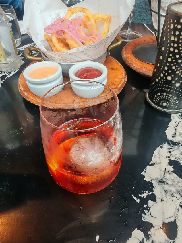 落地玻璃設計可以飽覽整個維港景致,無論係日頭定夜晚都咁靚,特別係黃昏時段睇住個天慢慢轉色。Happy Hour 叫左 signature cocktails,SPRING BREAK用咗Peddlers Craft Gin做基底,加入菠蘿同雜莓,面層鋪滿綿密乳酪泡沫,果香清新易入口。SICHUAN NEGRONI就係經典Negroni嘅變奏,帶點四川風味,飲落有微微辛辣感,幾特別但酒勁強,未必個個岩!小食叫咗炸洋蔥圈,炸得金黃香脆,送酒一流,不過有少少油。…查看更多