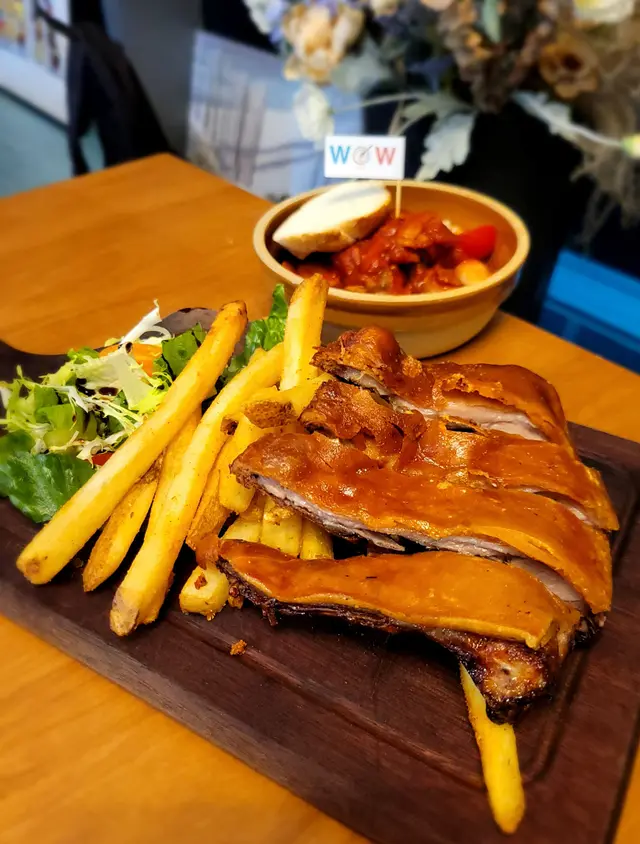 一走進 Wow Pasta,第一個感覺就是空間感十足🤩 ——樓底高挑,採光極佳,落地玻璃把整個城市的天際線框進來,無論白天或夜晚,都有不同的氣氛😎 午餐時明亮而愜意,晚餐則多了一份浪漫的都會感,令人不自覺地放慢節奏✅ 先來前菜,刁草煙三文魚沙律是個清新的開始😋 三文魚鹹香細膩,煙燻香氣淡而不搶,刁草的香味拖出魚的甜味,沙律汁酸度拿捏得好,開胃得剛剛好🌟 接著的意式蕃茄焗肉丸熱香撲鼻,肉丸紮實又多汁,蕃茄醬汁濃而不膩,微微酸甜令整體更添層次👍 主菜時間❣️ 不得不提他們的招牌西班牙烤脆皮乳豬 ——份量實在,外皮香脆得像玻璃一樣,切下時清脆作響,肉質卻保持嫩滑多汁❤️ 肥瘦分明但不油膩,一口咬下滿是香氣☺️ 配上的薯條香脆迷人,完美中和了乳豬的濃厚滋味🤗 喜歡海鮮的人,不妨試試刁草檸檬帶子墨魚麵✅ 黑得發亮的墨魚麵彈牙有嚼勁,檸檬的清香與刁草的草本香交織,把帶子的鮮甜襯托得更明亮👍 整道菜層次感很豐富,吃起來一點都不膩😋 甜品部分是杜拜開心果仁朱古力心太軟配雪糕🍫 ——切開那一刻濃郁的朱古力漿緩緩流出,甜度恰到好處😉 開心果碎增添香氣與口感,配上冰凍雪糕,一冷一熱的對比令人滿足😙 最後來一杯濃縮咖啡湯力水,苦中帶酸,氣泡清爽,正好作為一餐豐盛盛宴的結尾🌟 …查看更多