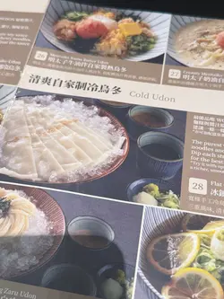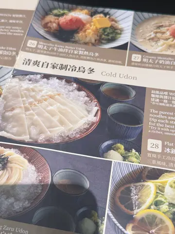 这次再来双子汇食饭,选了这间颇具人气的乌冬店,之前食饭时间经常见到门外有人排队,这次假日午膳时间(12时许)竟然不用排队直入。餐牌上有很多不同乌冬选择和食法,此店最有名的应该是阔条乌冬,不过每日限量发售。我对特殊形状的乌冬没有什么兴趣,叫了经典的冷乌冬和热乌冬。