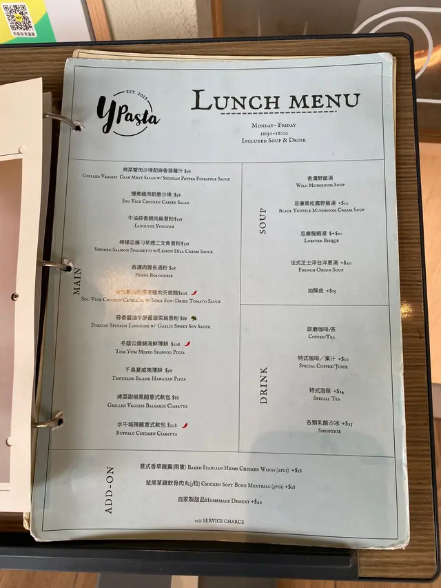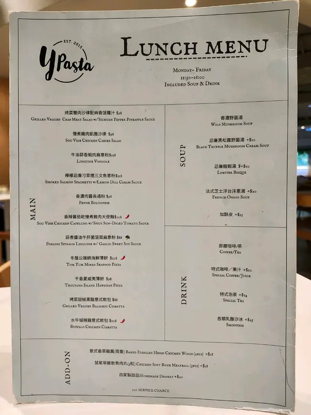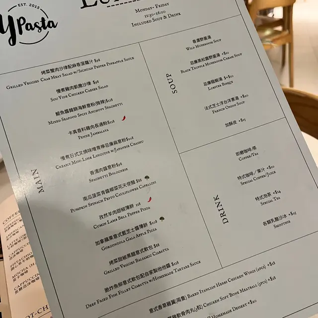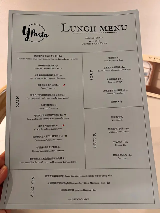 Y Pasta (沙田) 网上订位即赚Rice Dollars 网址: https://s.openrice.com/QrLS0DeGC00 地址: 香港沙田橫壆街1-15號好運中心3樓3080號舖 电话: +852 53011818