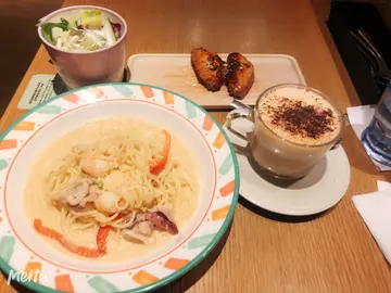 紫薯鲜奶+$8原本以为唔系几够甜,但系越饮越甜,紫薯味道浓郁,但系甜到好似唔系几适中软壳蟹明太子汁意粉🍝$128原只软壳蟹,都几大只,够脆,但系明太子味完全食唔出,而且食食吓都几腻,同埋佢冇其他配料,食到中间会觉得好闷而牛油果大虾意粉🍝($118)个汁好淡,都系食食吓会腻,我就唔系太中意而汉堡扒滑蛋饭($118)尼个好好食,份量好多全部套餐都有茶或者咖啡咖啡有得拣Latte or cappuccino…查看更多