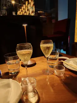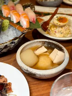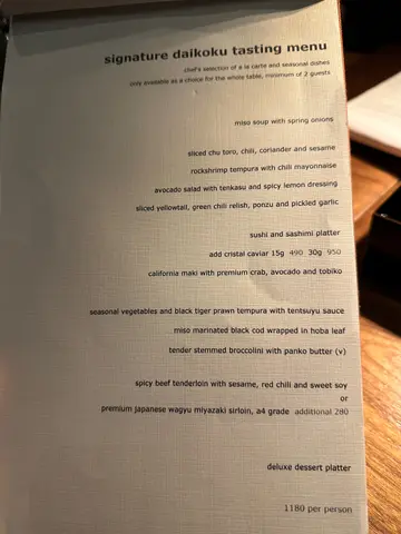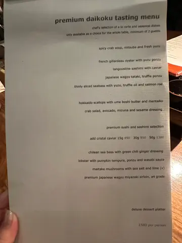 之前睇OpenRice啲评语有啲担心,但亲身去完觉得整体体验几好!现场环境真系冇得输,现代和风设计加柔和灯光,气氛浪漫有格调,有现场live band,中间仲有火焰表演,较夜后音乐会逐渐加大,似去左party咁。虽然见有人话服务一般,但当日我觉得算唔错。可能因为除主菜外,所有食物同饮品都系无限追加,侍应确实忙,但态度友善。酒类选择亦非常多,香槟清爽易入口。食物整体卖相佳,味道亦不俗。总括来讲,如果抱住食高级餐厅嘅心态可能会有小失望,但当系升级版半自助餐,重点放喺享受环境气氛同free-flow酒水及食物,咁样心理平衡啲,性价比都算合理。特别觉得荔枝玫瑰马天尼非常好饮,水果味同酒味平衡做得好好又唔会过甜。食物种类相当丰富,前菜我最钟意芝麻菠菜同火炙三文鱼,味道清新又开胃。刺身质素就普通啦,当我哋讲明要再encore刺身时,侍应竟然推咗成只‘刺身卷船’出嚟,跟埋全部手卷,服务以高级餐厅而言,系唔够细心嘅!另外,天妇罗有虾有蔬菜,炸得薄脆,唔油腻,不错。主菜西京烧银鳕鱼同辣汁牛柳,味道都唔错,合乎预期。最后仲有甜品盛合,卖相靓但偏甜。小丸子串几特别,系外层似糖浆,内裹系液态的,上面系爆加糖。…查看更多