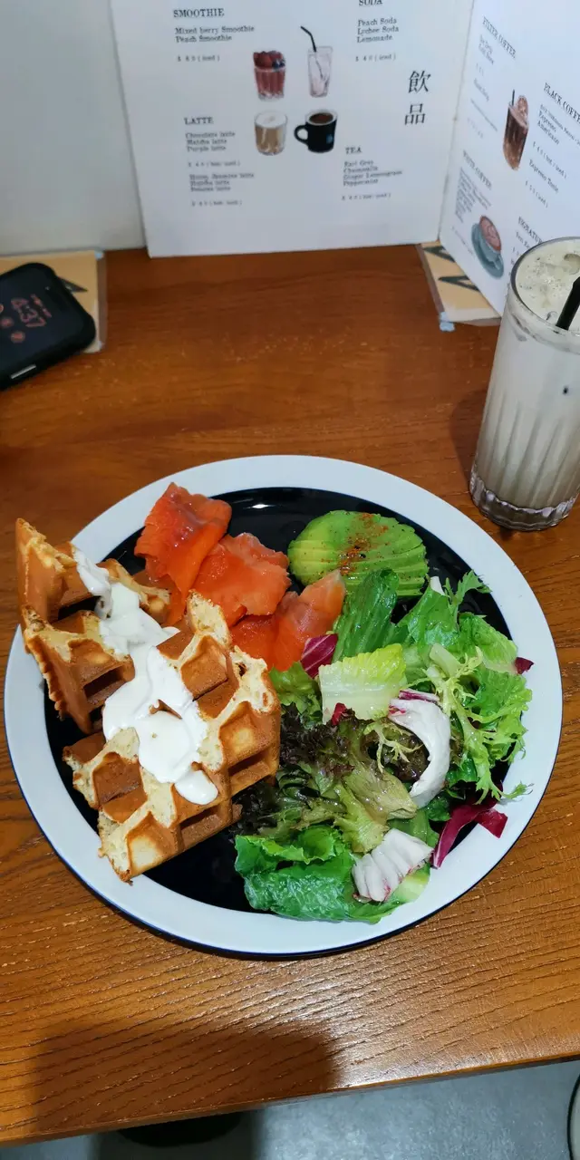 牛油果、三文魚忌廉芝士兩格窩夫配沙律 $80