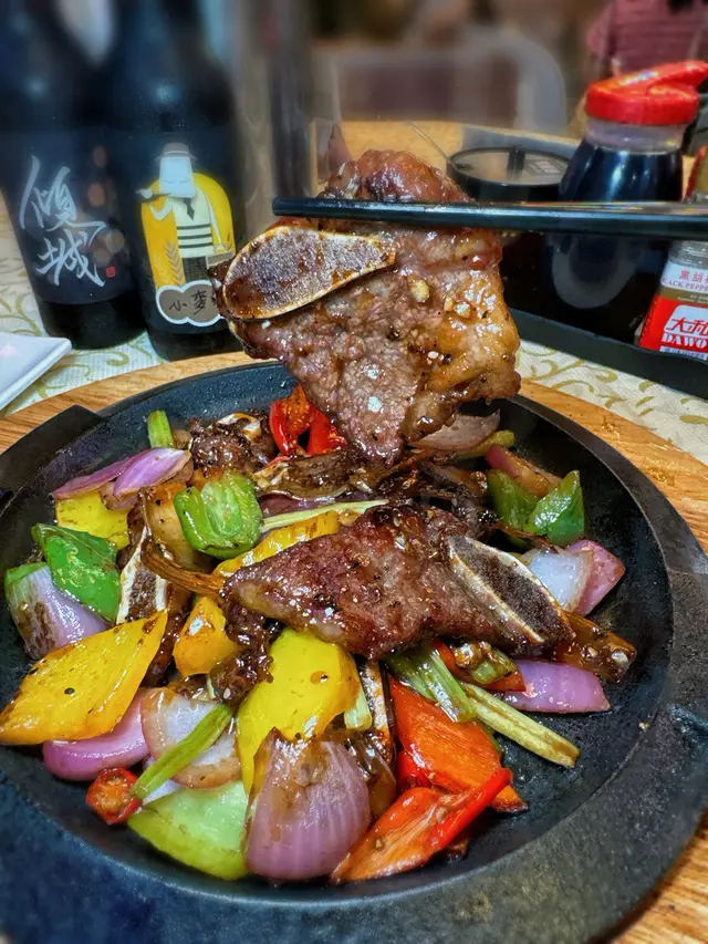 鐵板上熱辣辣令黑椒汁滋咋響,牛仔骨入晒味都唔靱