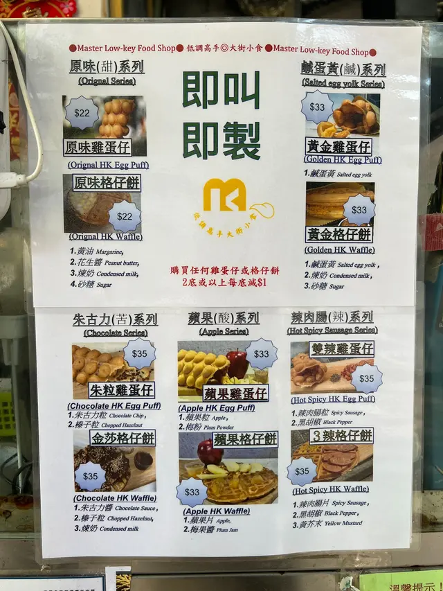 One of the popular snack bars here is < Master Low-key Food Shop >, which specialises in the Hong Kong traditional egg waffles (格仔餅) and egg puffs / eggettes (雞蛋仔).