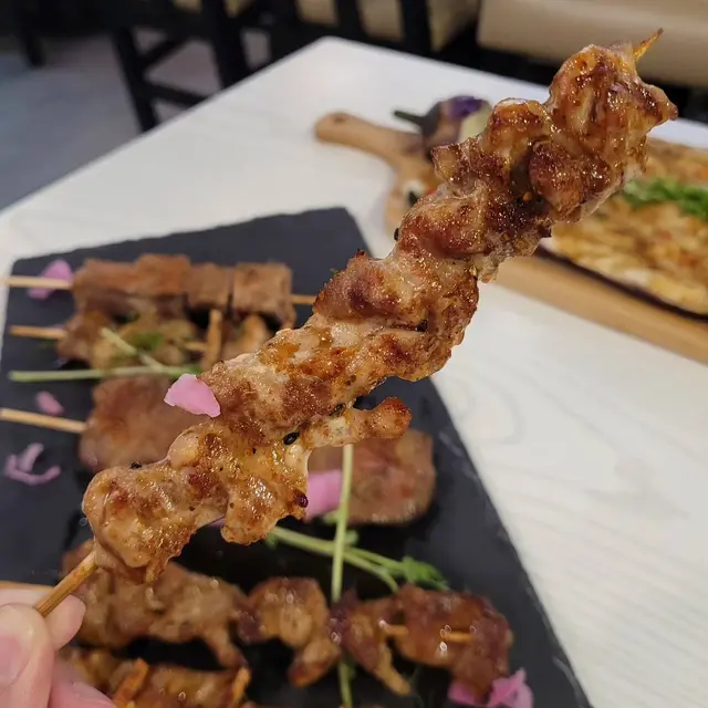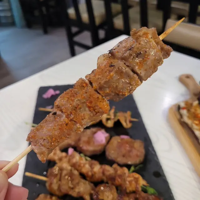 山椒燒豬頸肉串烤出了漂亮的色澤,讓人食慾大開,山椒燒豬頸肉串是老饕首選,吃過的人讚不絕口,豬頸肉脂肪分佈均勻,彈韌的肉質嚐起來充滿嚼感,嗆出山椒香,山椒燒豬頸肉串獲得朋友好評。