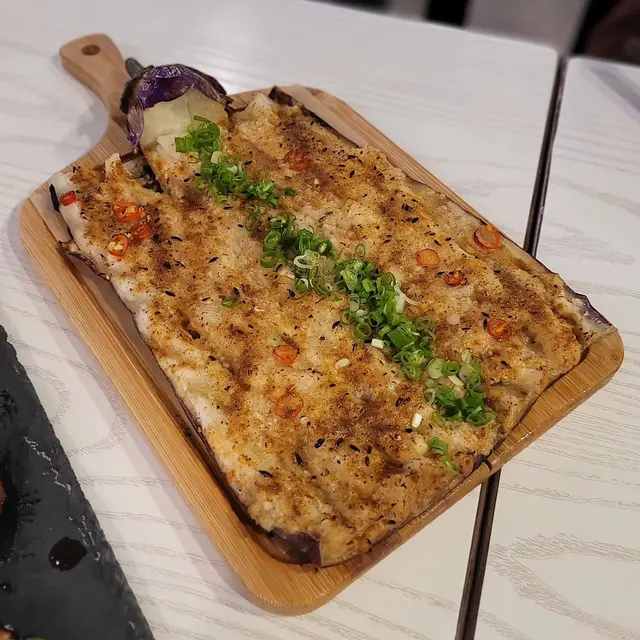再來是蒜蓉燒原條茄子,一起將一條完整的茄子剖開,並在茄子裡面加入青蔥、蒜蓉跟辣椒後燒烤。我們急不及待用筷子把茄肉夾出來吃,茄肉軟軟嫩嫩的,蒜蓉亦能為茄子適時提味。