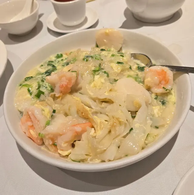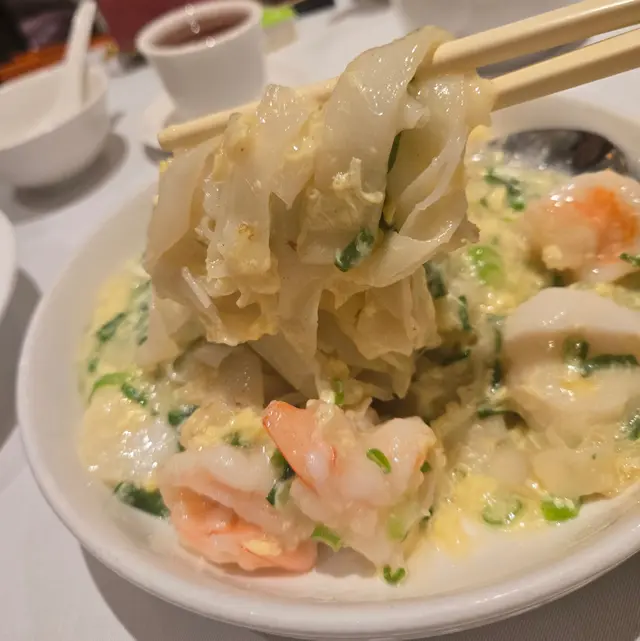 滑蛋蝦球帶子炒河現在較少酒家可嚐到,力寶軒依然品嚐得到,滑蛋蝦球帶子炒河勾芡濃稠度適中,呈現滑蛋香滑一面,雖然炒河泡在滑蛋勾芡裡,但不至於軟爛,仍具鑊氣焦香,炒河吸滿蝦球及帶子精髓,甜中帶鮮,蝦球新鮮彈牙,帶子飽滿鮮嫩。